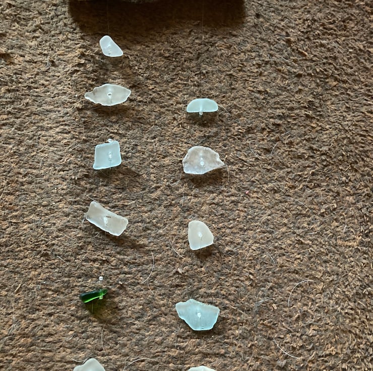 The driftwood has been home bleached. The glass pieces have been washed then drilled and threaded together using nylon fishing line (unused).