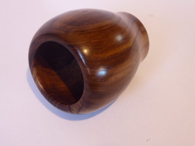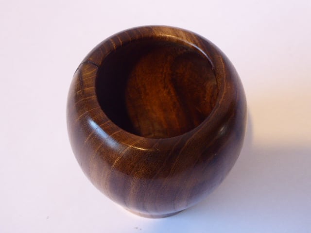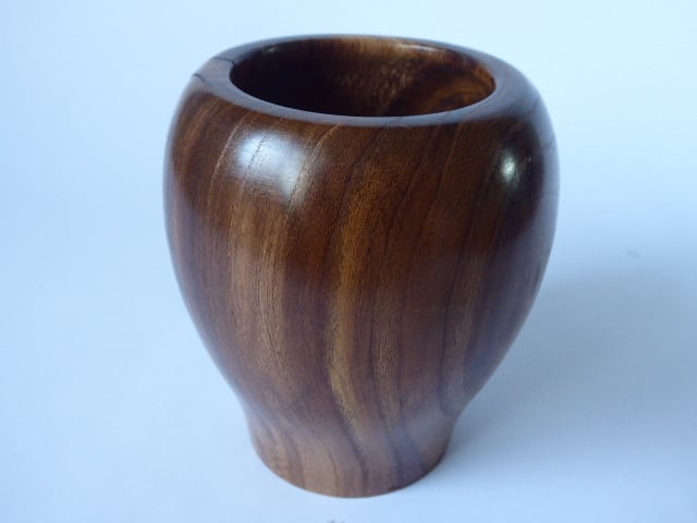 Small tulip shaped Laburnum wood vase. This piece is a good example of the naturally occurring black pith lines within the wood. This particular piece is generally dark in colour with some lighter sec ions, it also has the pith of the tree occurring down one side of the vase which looks like a fault. (The pith of the tree is the very centre of the tree and is effectively dead)