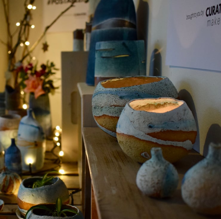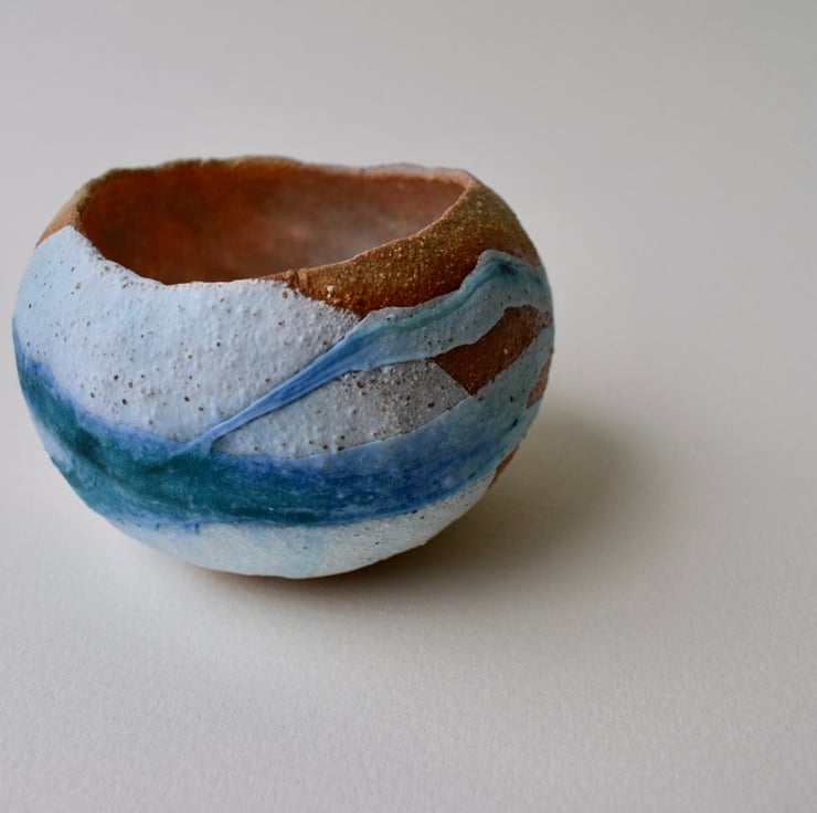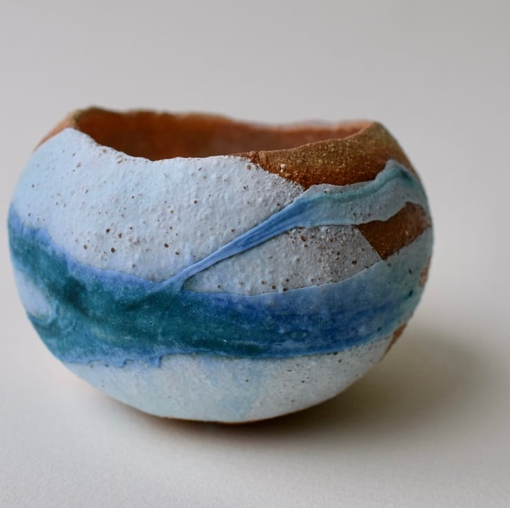 A ceramic pebble form made from a buff stoneware clay with overlapped turquoise glaze. It glows nicely with a votive light inside.