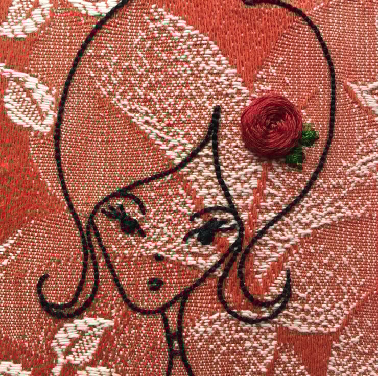 I have created the little 3D deep red rose in her hair using a spider web wheel, with vintage Anchor and DMC threads.