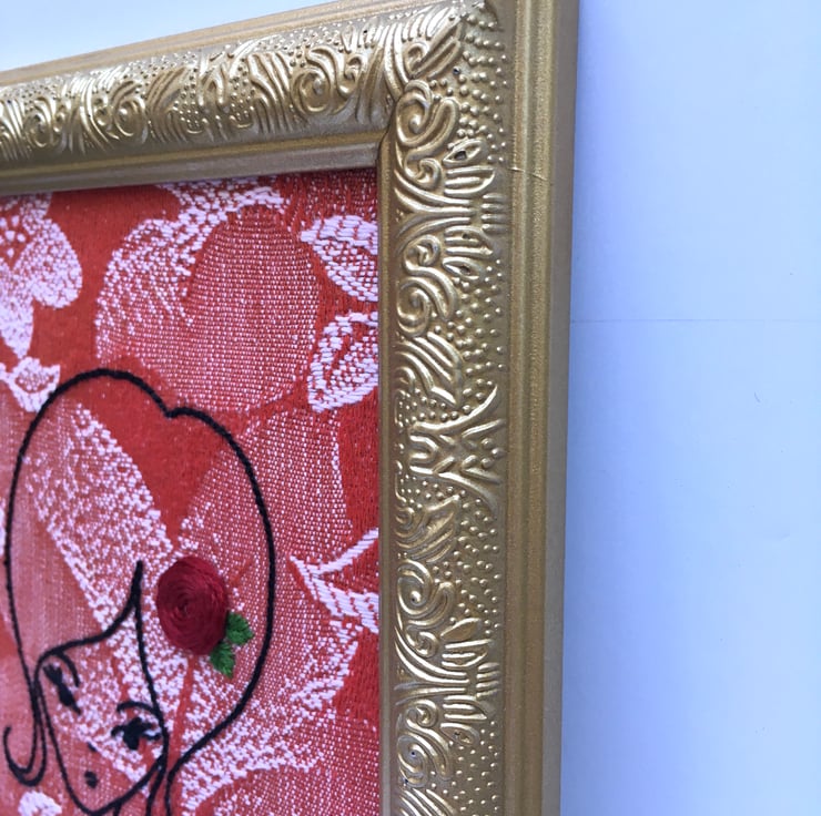 In the traditional manner I have laced and stretched this piece of textile art over acid free mount board then framed in a gold vintage frame without glass as it distorts the stitches.