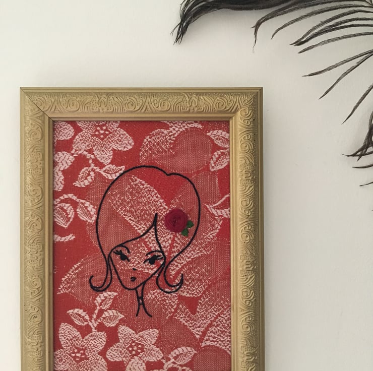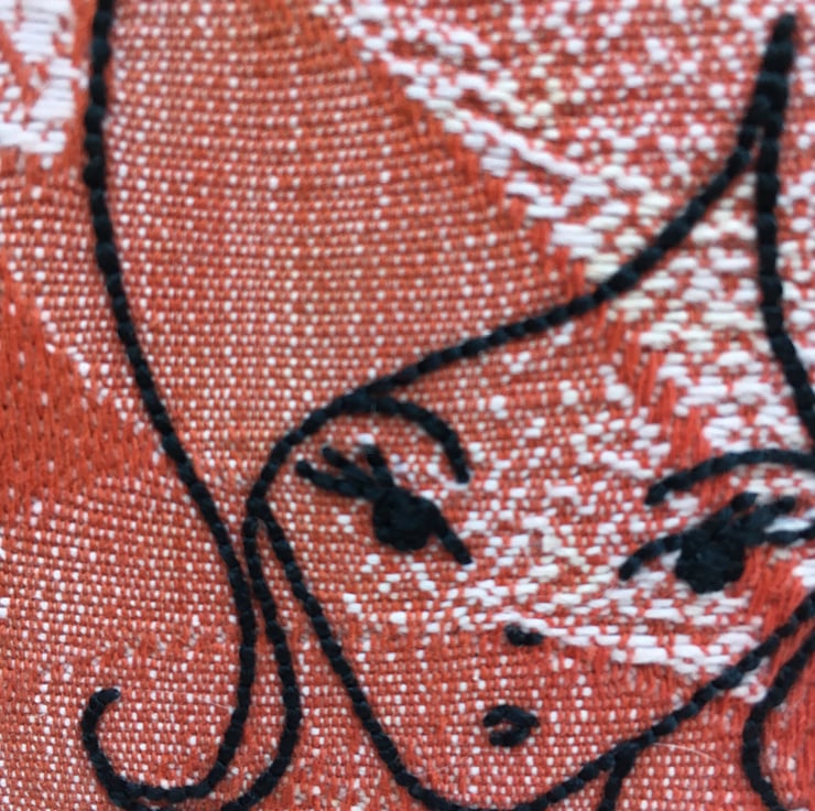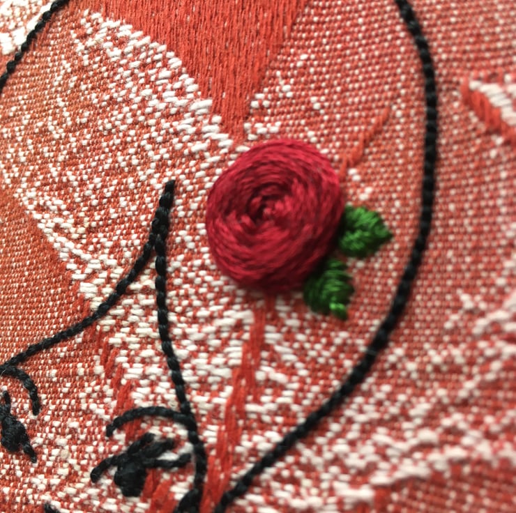 I have hand embroidered Verity on a beautiful piece of 1930’s russet jacquard fabric, which used to be my Grandmother’s cushion covers when I was a little girl.