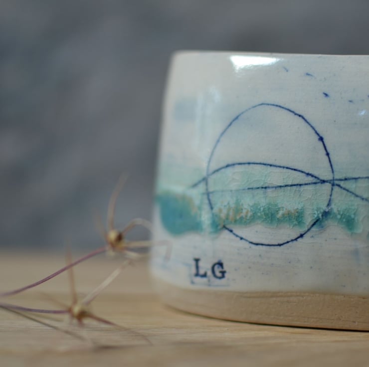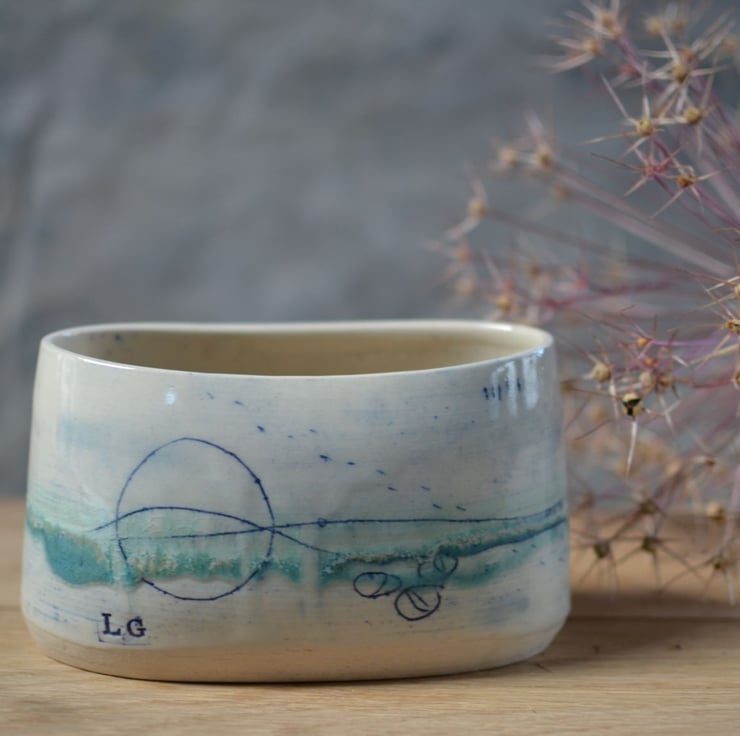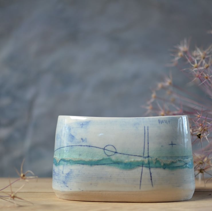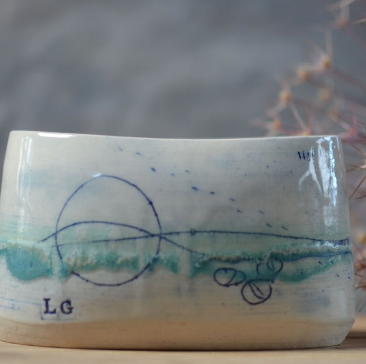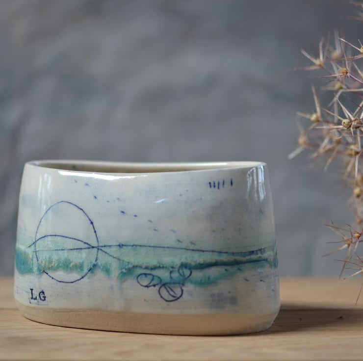 The ceramic pot is made from natural materials using as few resources as possible. With a mix of glazes and underglazes, it has a simple, undulating design that reflects the patterns of the ocean. Unlike most bowls, my seascape pot is oval, rather than strictly circular. It forms part of my Horizons collection of handmade pottery.