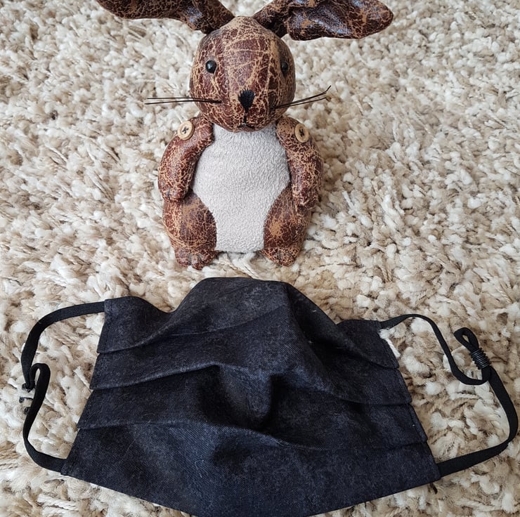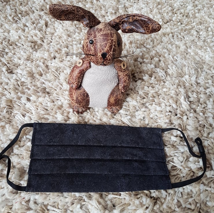 Adult face covering made from a black/grey mottled cotton. The face mask is made with 2 layers of cotton forming an inner pocket for a filter (not included) and is fastened over the ears with 2 loops of elastic and a toggle adjuster.