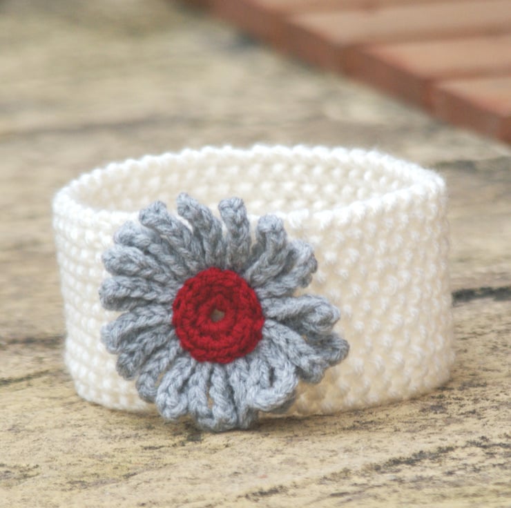 Finished with a crocheted ruffle flower in grey with a ruby centre