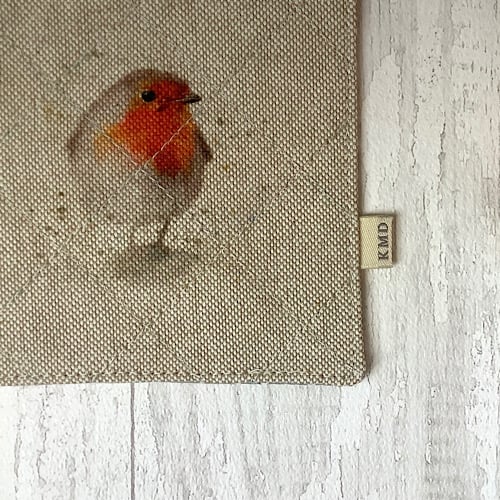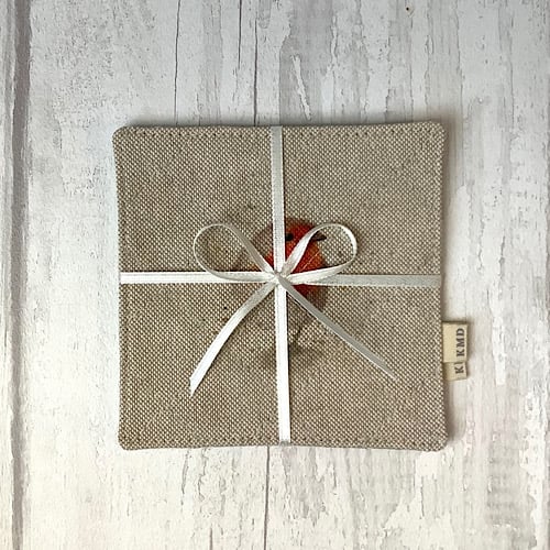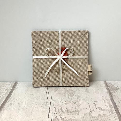 Fabric coaster set (x2) in a festive robin print on natural linen with a grey spot fabric on the reverse. Quilted. 10cm by 10cm.