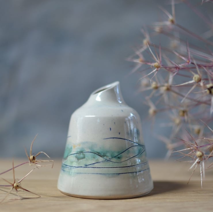 These beautiful handmade bottle bud vases are made from natural materials using as few resources as possible. With a mix of glazes in blues and greens, it has a simple design that reflects the patterns of the ocean. It forms part of my Horizons collection of handmade pottery.