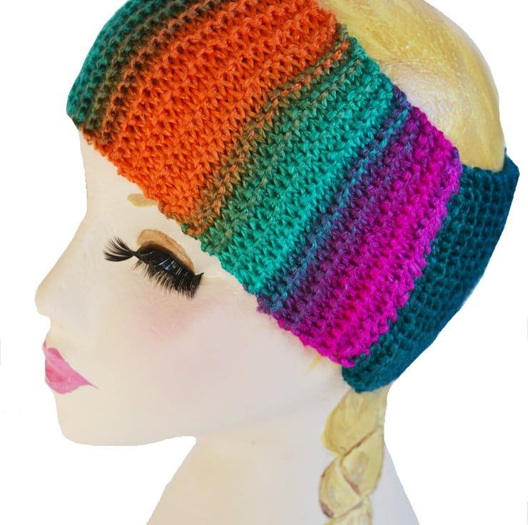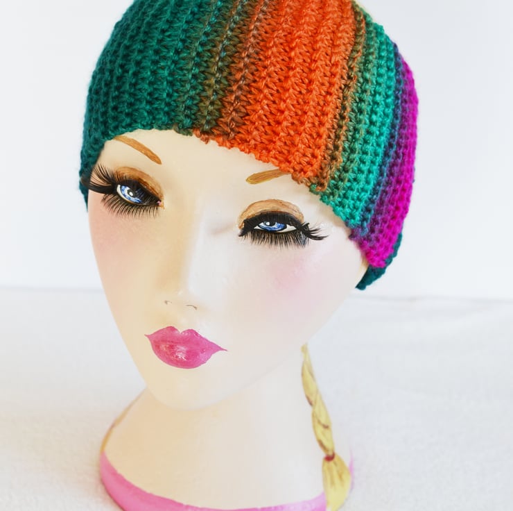 Knitted in a chunky yarn in a lovely random yarn in purple, cerise, deep petrol blue and jade