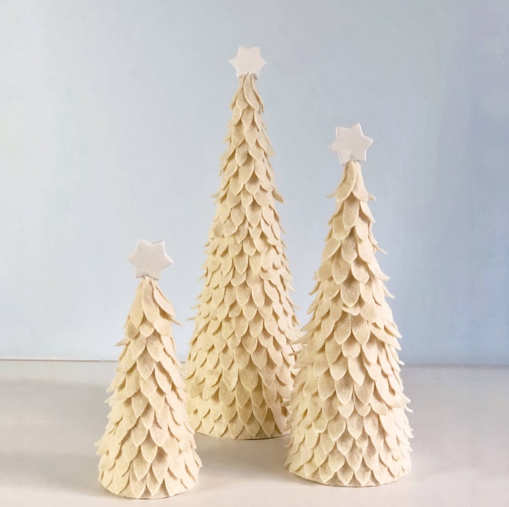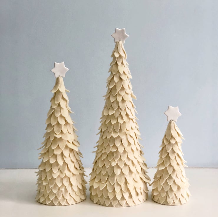 Treat yourself to these meticulously handcrafted ivory fabric Christmas Trees to adorn your home this Season. These felt trees - with leaves that were hand cut, glued and shaped one by one and accented with a charming clay star - can also be arranged on top of your mantel or even along window sills to give your windows a festive display.