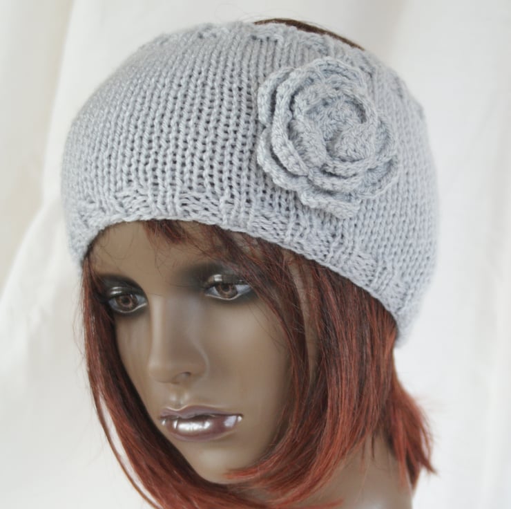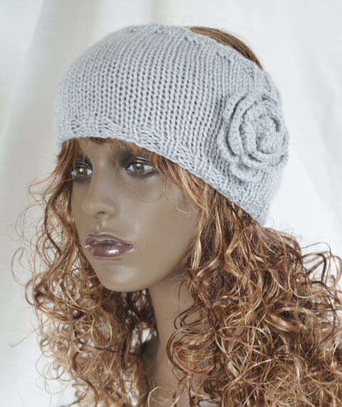 Light grey knitted wide flower headband earwarmer. Made in 100% acrylic yarn with a hand crocheted flower sewn to one side.