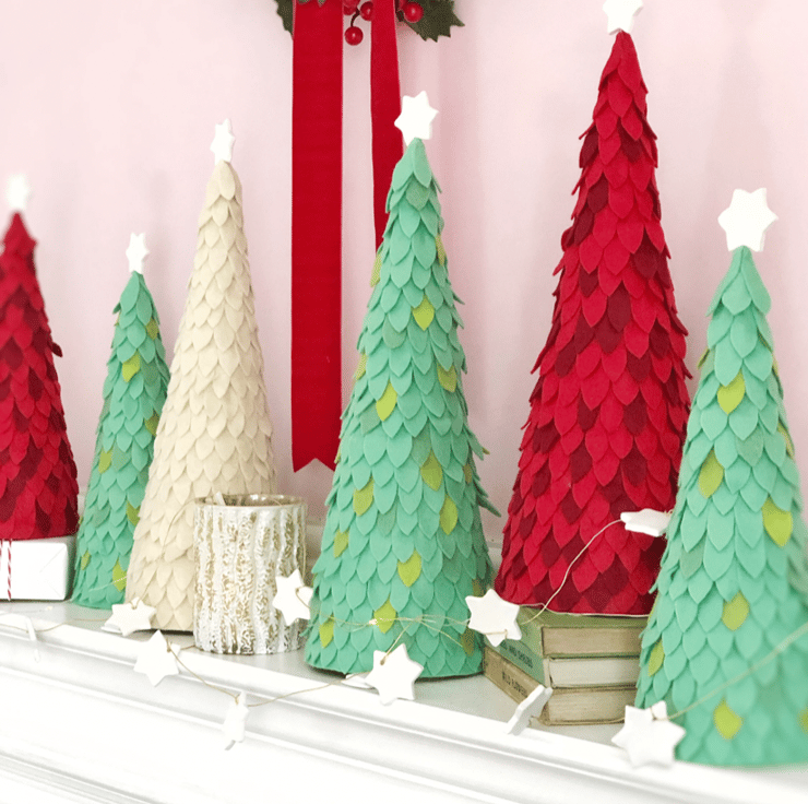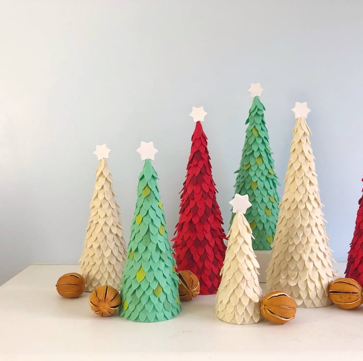 The leaves of these Christmas cone trees are a mix of wool and poly felt cloth. Each one is hand cut, then placed on a cardboard cone with hot glue. A clay star that I also made myself completes this Holiday display.
