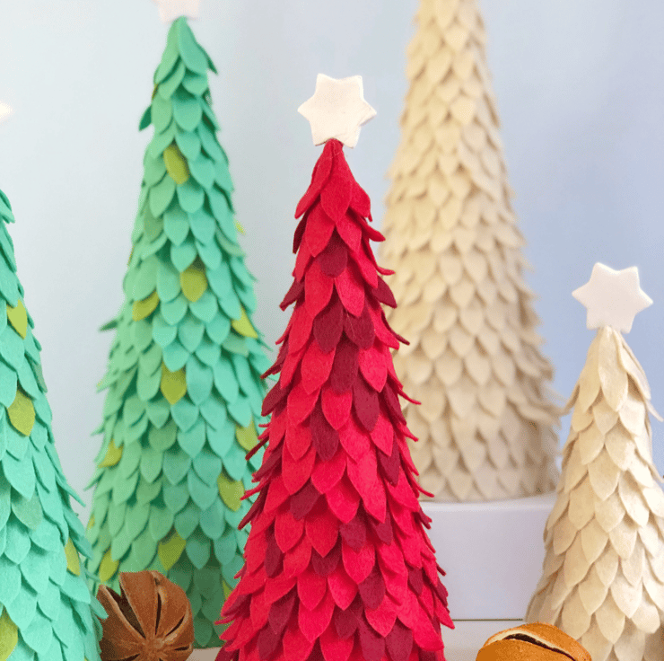 The leaves of these Christmas cone trees are a mix of wool and poly felt cloth. Each one is hand cut, then placed on a cardboard cone with hot glue. A clay star that I also made myself completes this Holiday display.