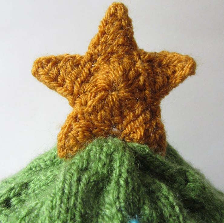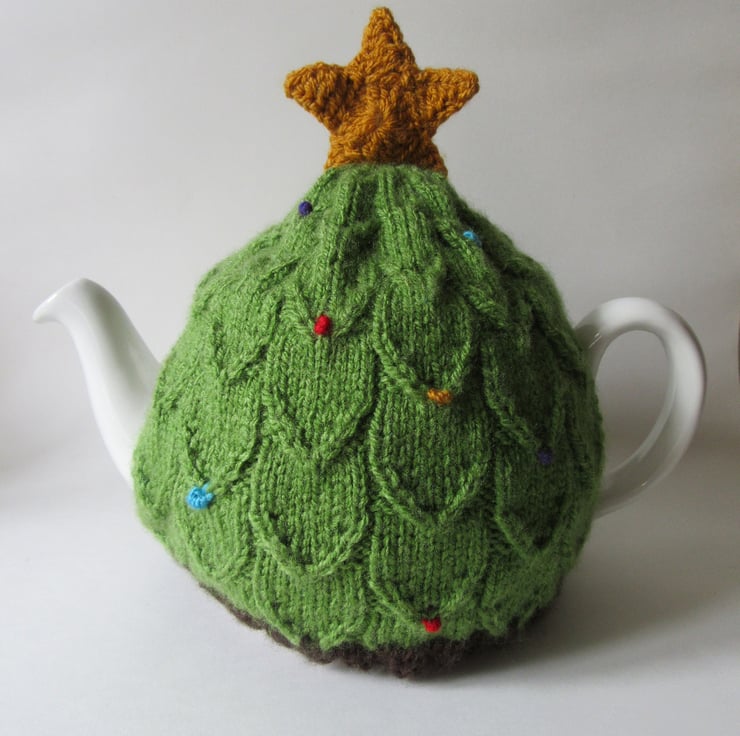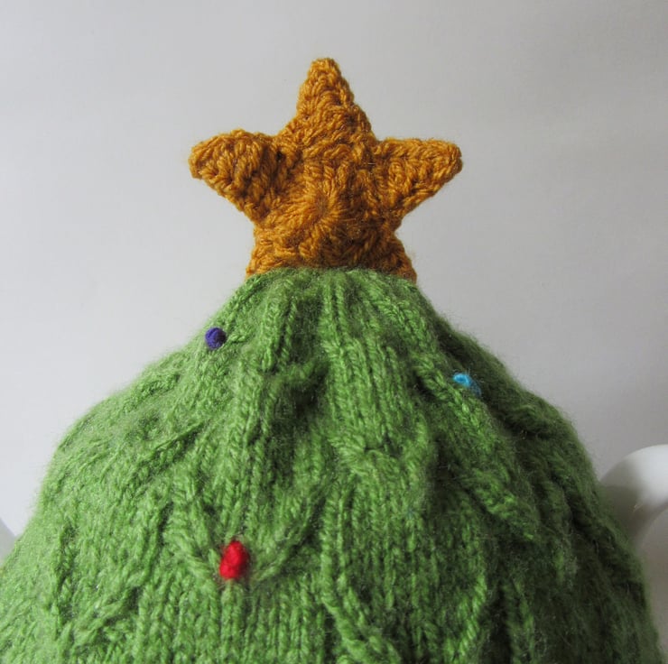 A beautifully hand knitted Christmas tea pot cosie. The body of the cosie is knitted in a Christmas green coloured yarn using open cables to mimic tree branches, on the ends of which there are random coloured french knots in turquoise, purple, berry red and gold to depict little hanging baubles. Nestled on the top is a gold crochet star. Around the bottom is a brown rib just like the trunk of a tree. This stitch ensures a good fit around the pot, yet has enough ease for a swift removal when a 'top - up' is required. The tea pot handle peeps through the side opening so it dosnt get too hot to handle.