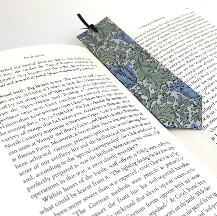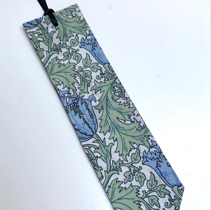A gorgeous dark brown leather bookmark with a lovely green and blue floral fabric on the other side, finished with a black ribbon tail.