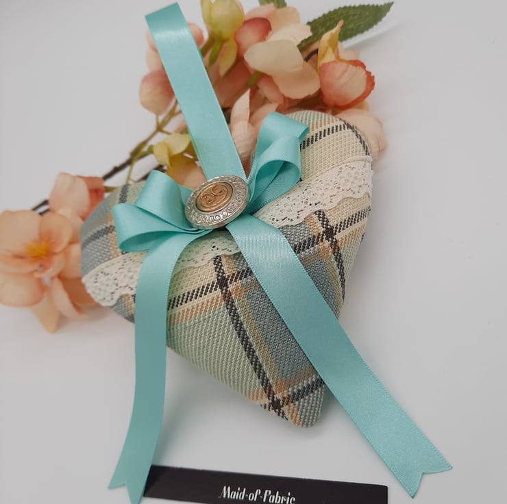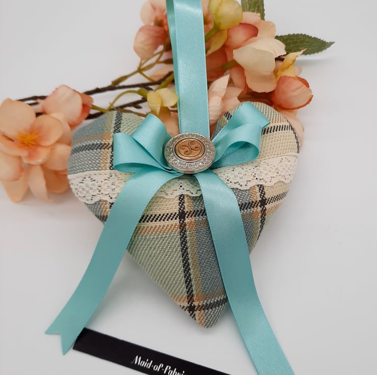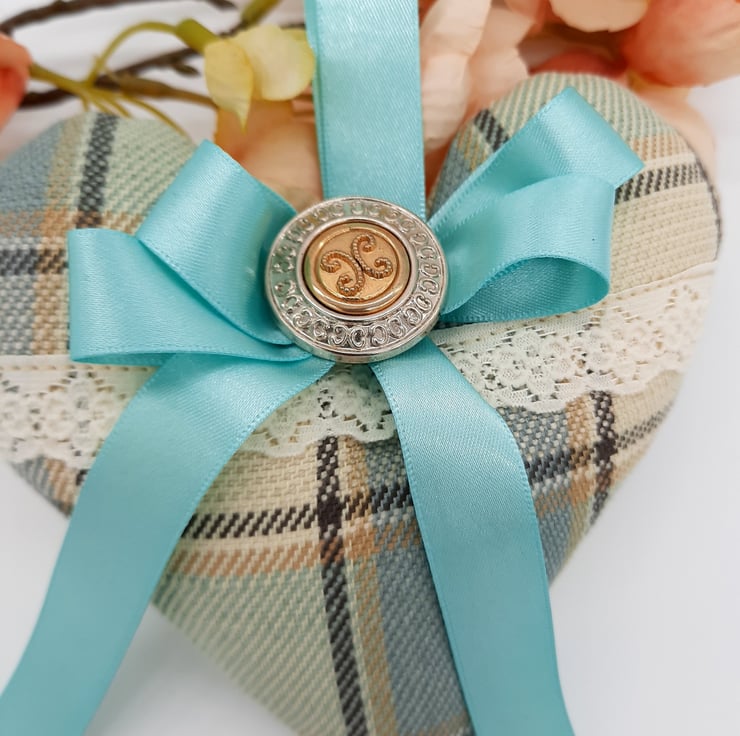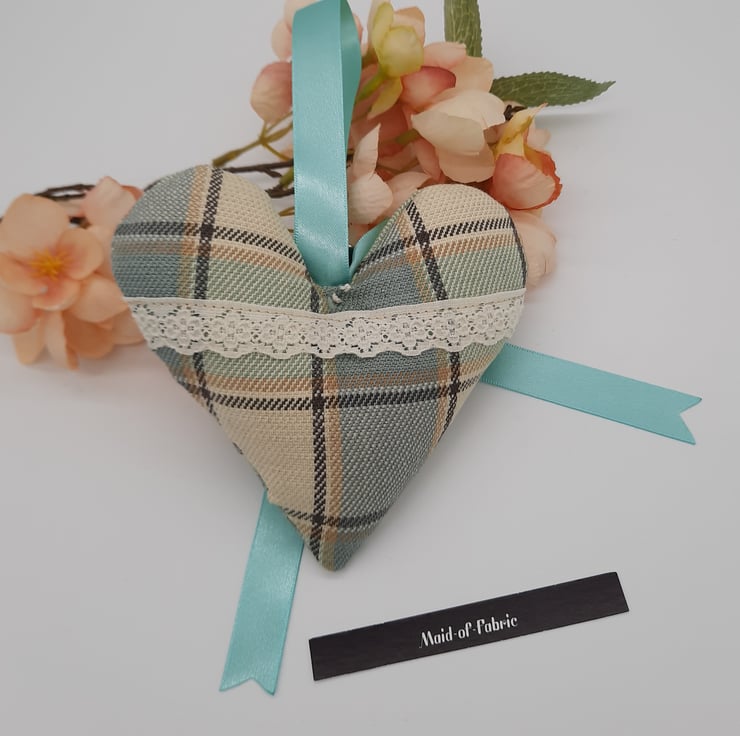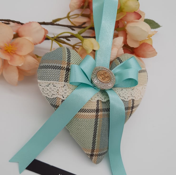 Heart hanging decoration made using cream and green check fabric, a mint green ribbon, cream lace and a silver and gold effect button.