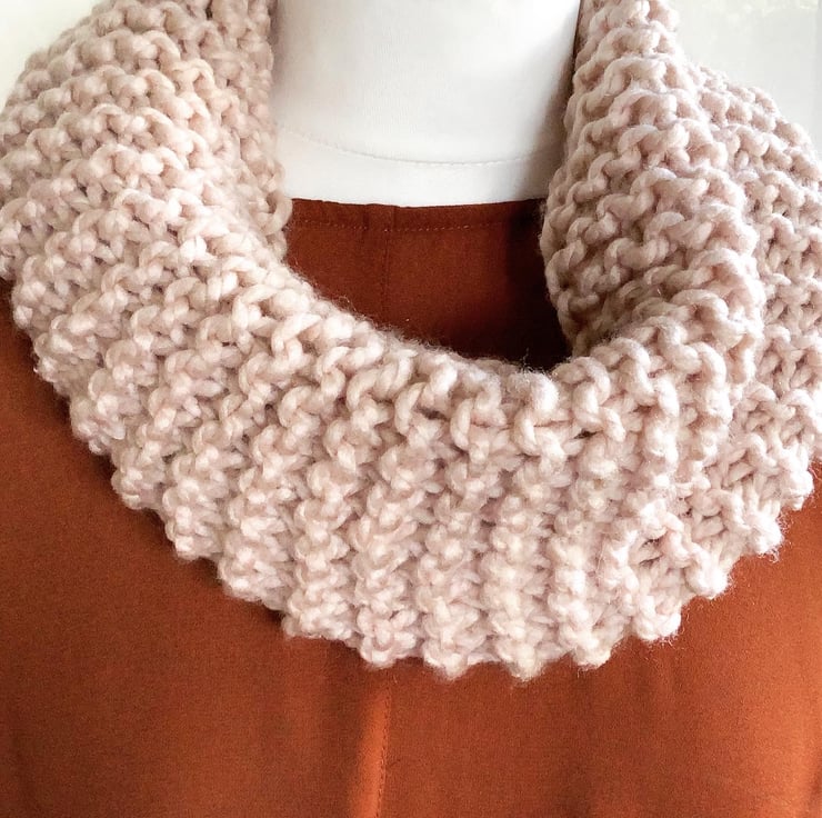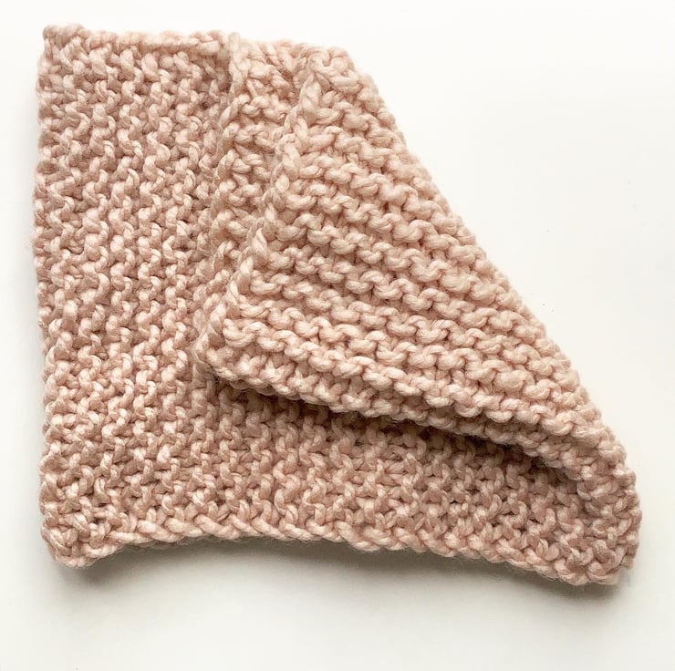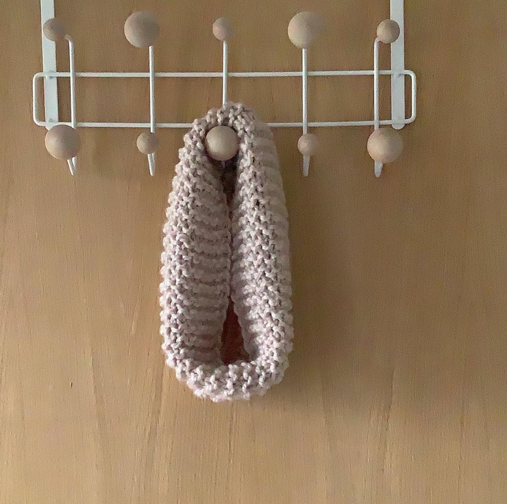 Knitted in garter stitch the cowl is foldable so can be worn around the neck or higher around the head to keep chilly winds away from your nose and ears.