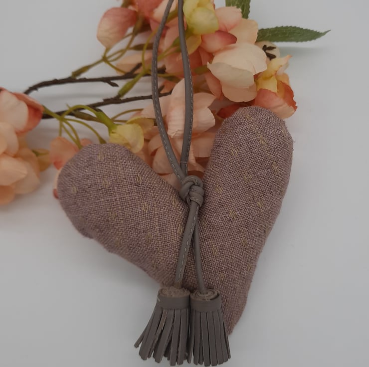 Heart hanger made using a dusky pink and grey fleck fabric and a grey tassel hanging cord.