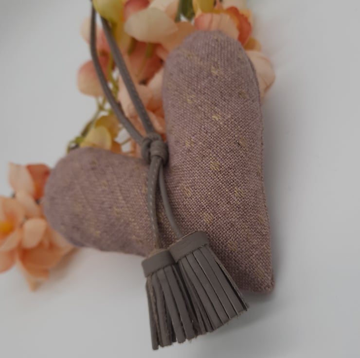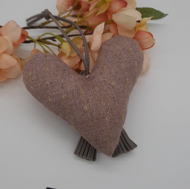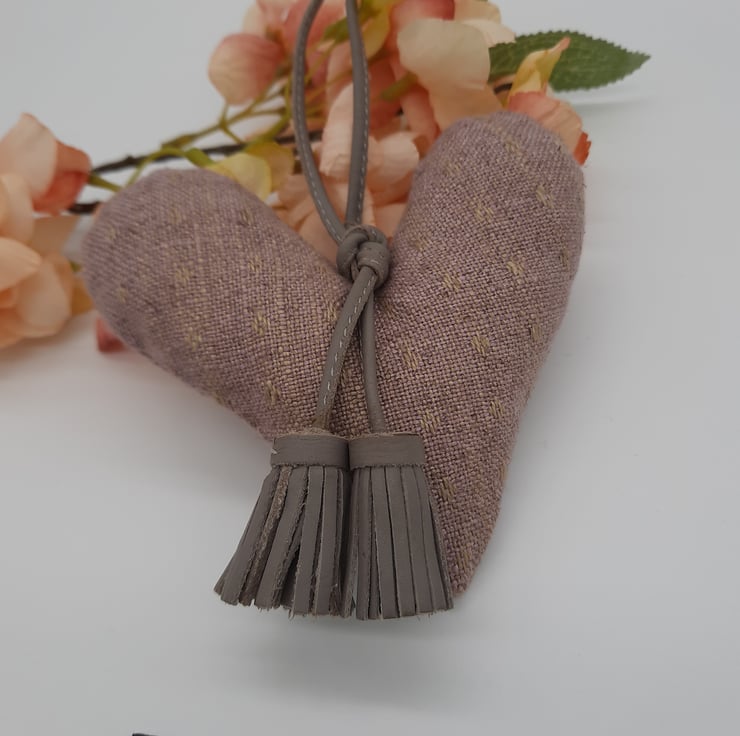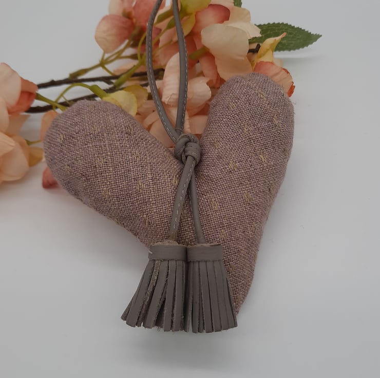 Heart hanger made using a dusky pink and grey fleck fabric and a grey tassel hanging cord.