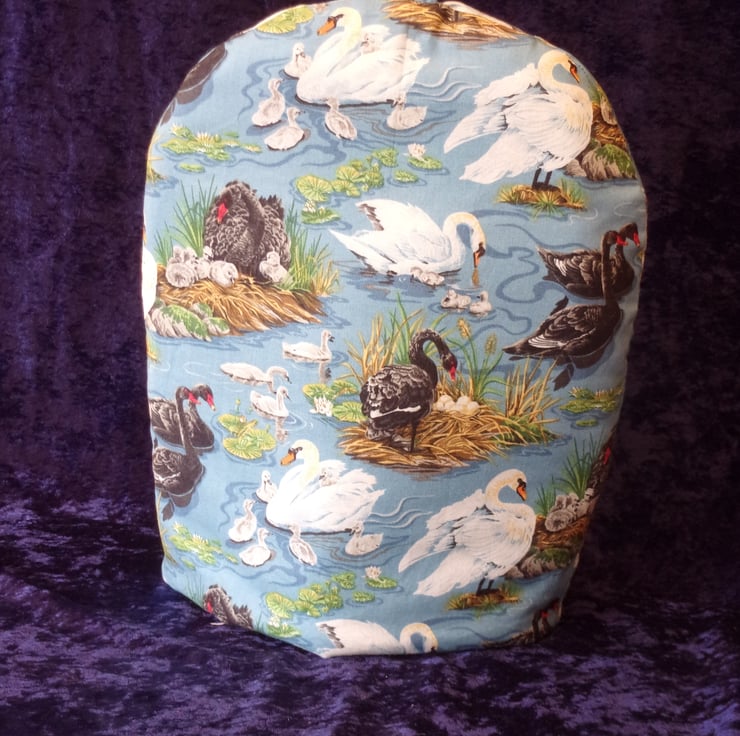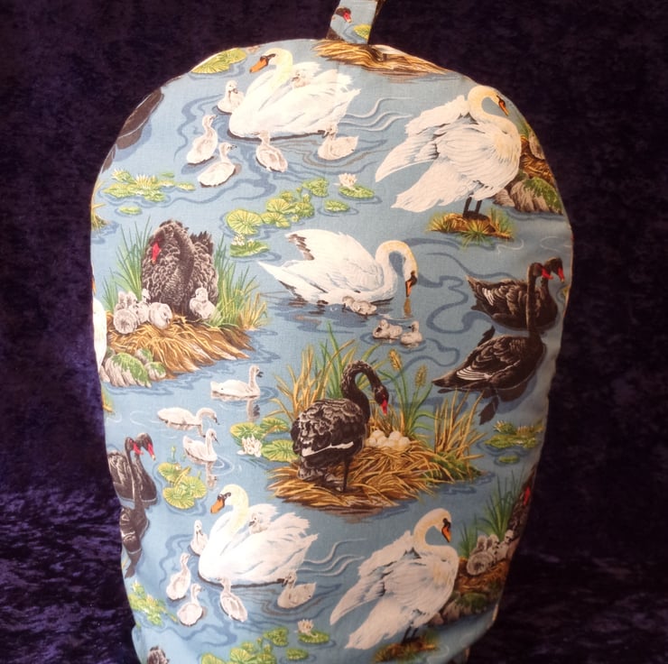 The design shows Black and White Swans with their cygnets on a Blue Background.