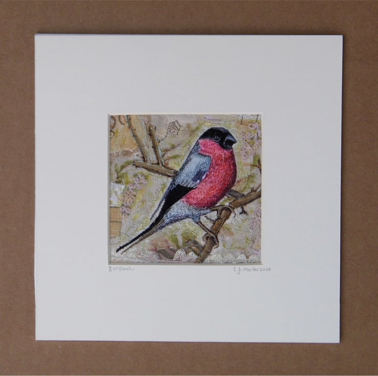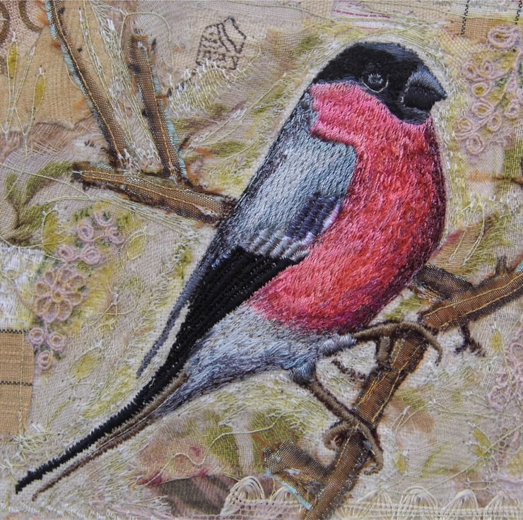 A Machine embroidery design of the plump blushing Bullfinch on a branch. On a collage background of vintage fabrics including silk and lace. Mounted with acid free off-white mount card.