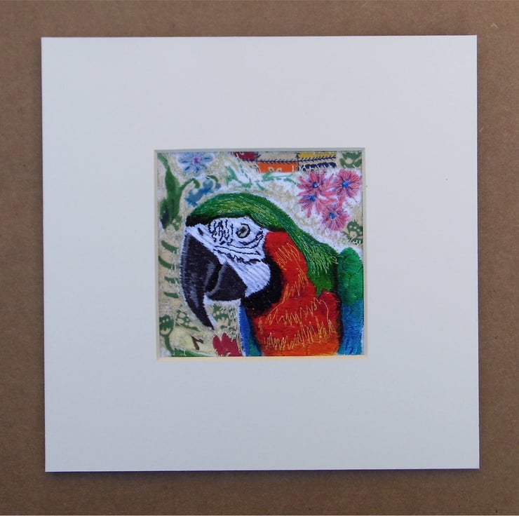 Profile portrait of a vivid parrot in machine embroidery. A collage background of vintage fabric scraps. Mounted with acid free off-white mount card.