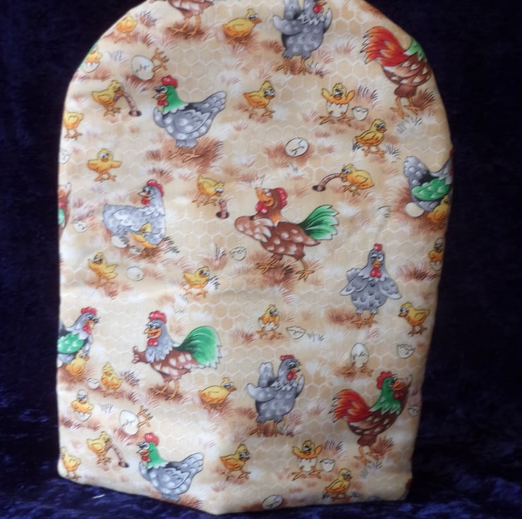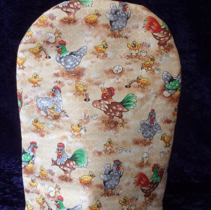 The design on this cosy is of cartoon chickens, chicks and cockerels. Some of the chicks still have their eggs attached and look like they are wearing a pair of shorts.