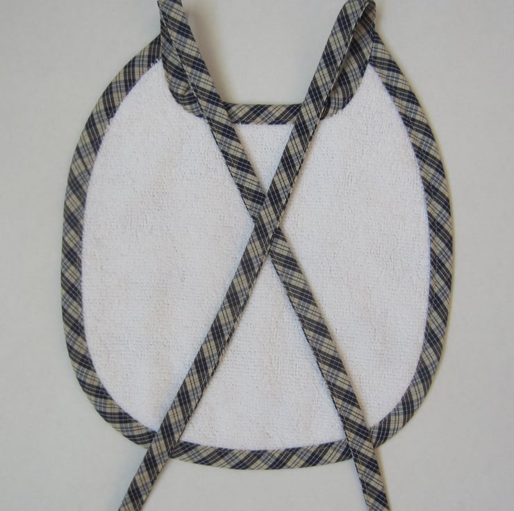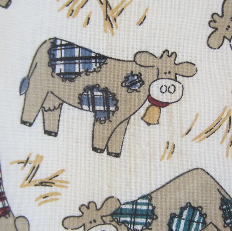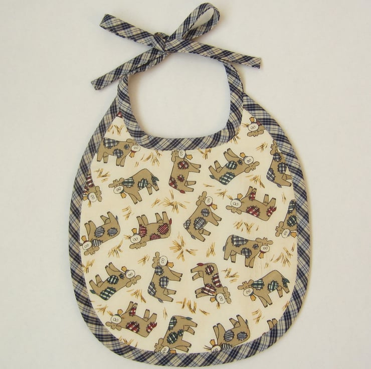 Babies bib featuring cows on a cream background. It is edged with a soft feel navy blue and cream check bias binding and is backed with white towelling.