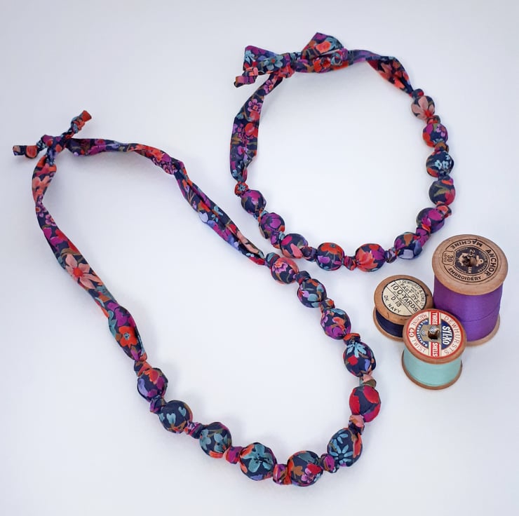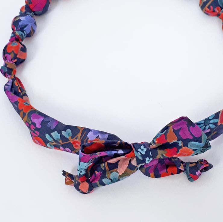 This Liberty print fabric necklace can be tied with a bow or a knot to vary the length from choker to mid chest. It is made out of Tana Lawn 100% cotton and so feels very soft next to your skin and has just the right weight to it to make it hang nicely.
