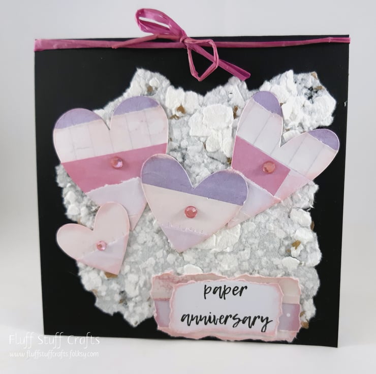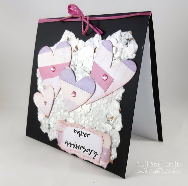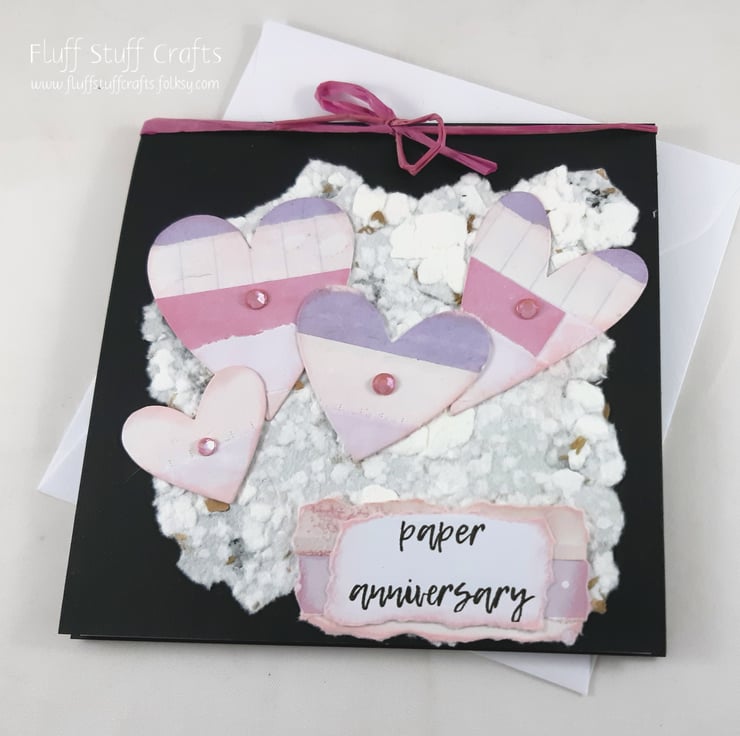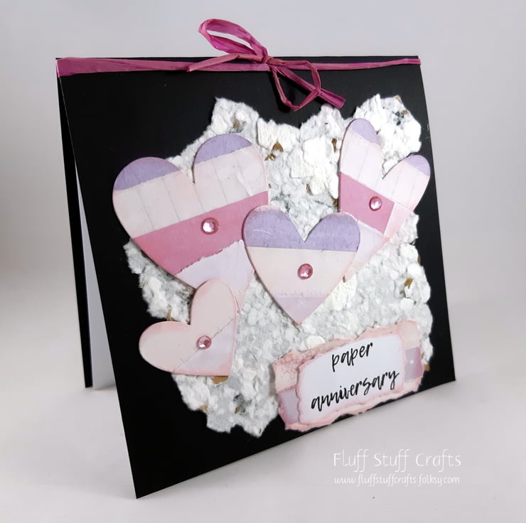 Square, black, first (paper) anniversary card featuring 4 hearts, die cut from a collaged sheet, overlaid onto handmade paper. The hearts and sentiment 'paper anniversary' have been edged with pink distress ink and the hearts finished with small pink gems. The card is tied at the top with pink raffia ribbon.