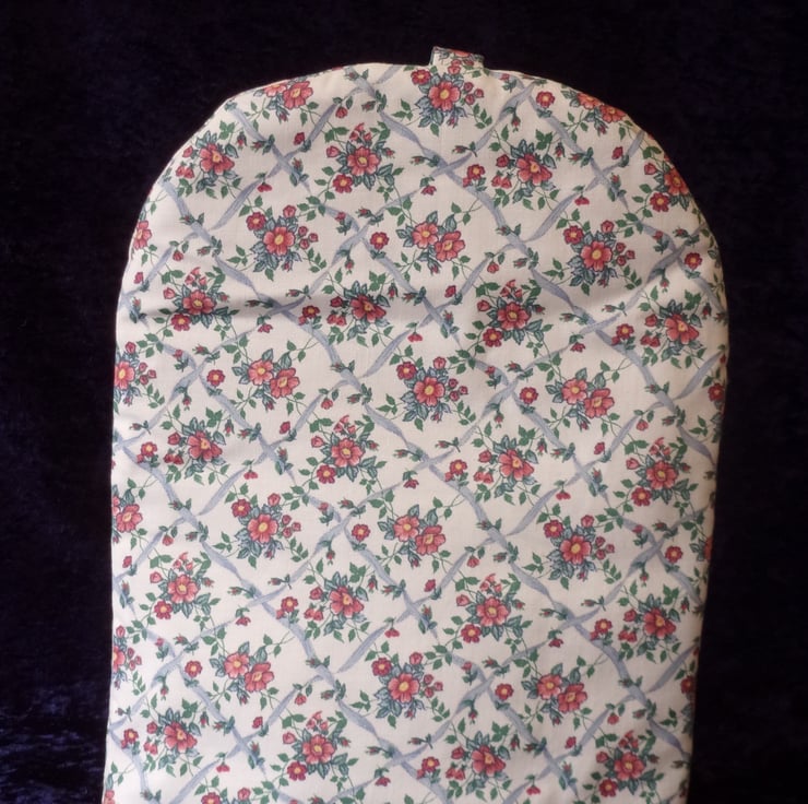 The design on this cosy is a Blue Trellis with small pink flowers on a white background.