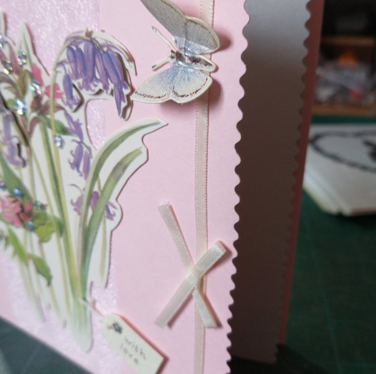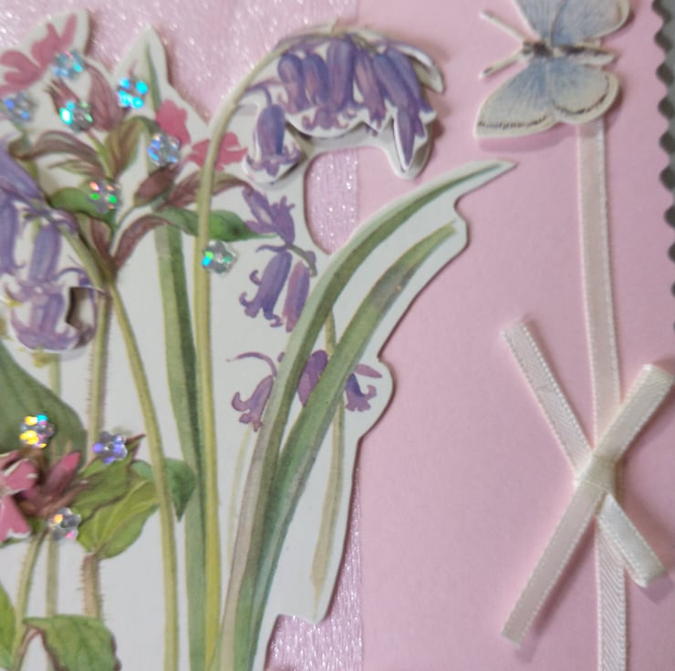 A completely handmade and uniquely designed card. Consisting of quality pink card which has a pretty floral decoupage mounted onto silver fine glitter. Finished off with a with love tag and a cream ribbon and bow