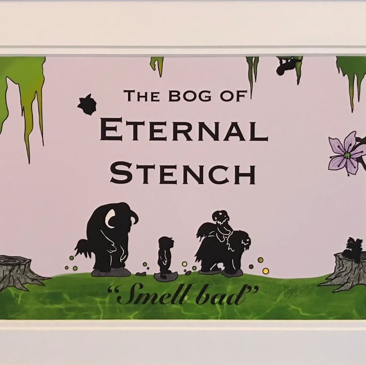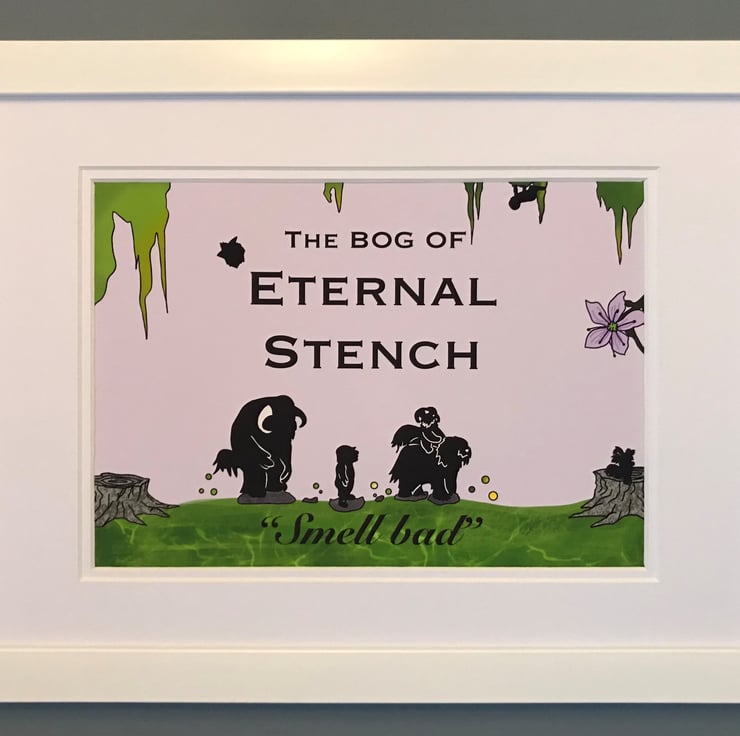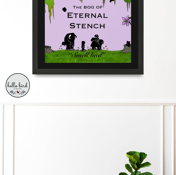 Unique print of my original design inspired by and celebrating the classic 80’s film ‘Labyrinth.’ Set on a lilac background, this piece has hand drawn silhouette illustrations of characters from the movie crossing the bog of eternal stench. Features the quote from Ludo “Smell Bad!” Can you spot the missing baby? How about the head of a firey or a friendly worm?