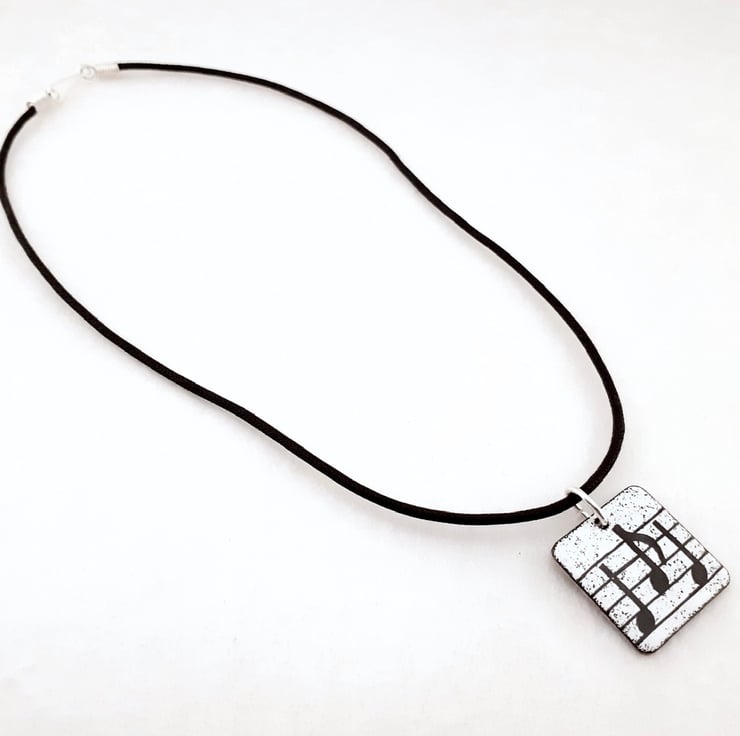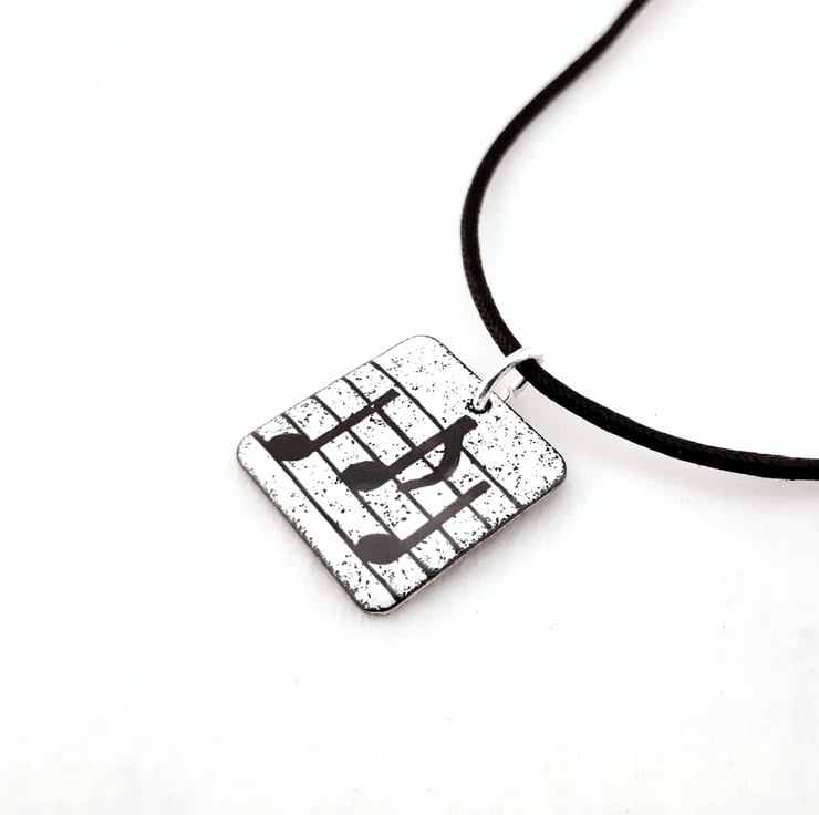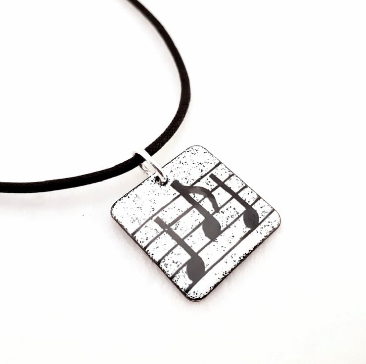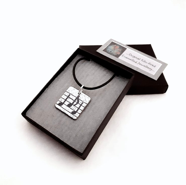 A small square 22mm black and white kiln-fired enamelled copper pendant with musical notes, this would make a great gift with unisex appeal to friends and family alike with an interest in music. The pendant is suspended from a black cord with a silver-plated catch which I offer in a variety of lengths. Please choose from the options given. The musical notes pendant is enamelled in several layers on both sides, with firings in between. The detail of the music is applied in the final layer. The mixed colour enamel on the reverse gives strength and durability. The pendant will arrive presented in a gift box and sent by Royal Mail 'Tracked’ delivery inside a protective outer card packaging box.