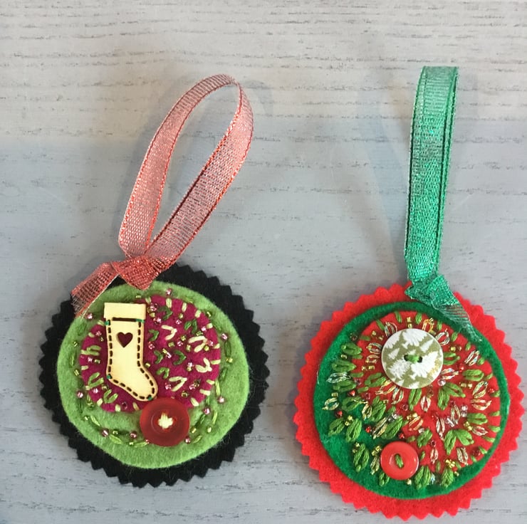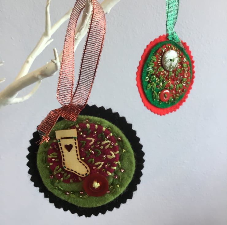 This is a set of 2 double - sided Hanging Decorations. On one side, each decoration has a hand embroidery reflecting the season of Christmas in festive colours of reds, greens and golds - using buttons, wooden motifs, embroidery stitches and beads. With their sparkling red and green ribbon hanging loops these home decorations glisten in the Winter light. On the reverse side, each decoration has a Christmas message or motif.