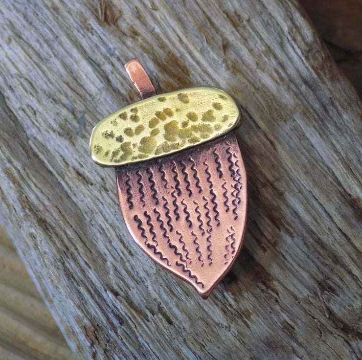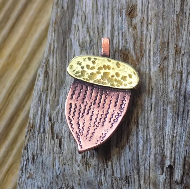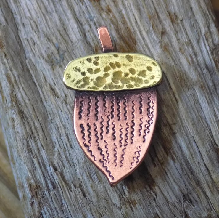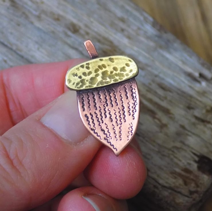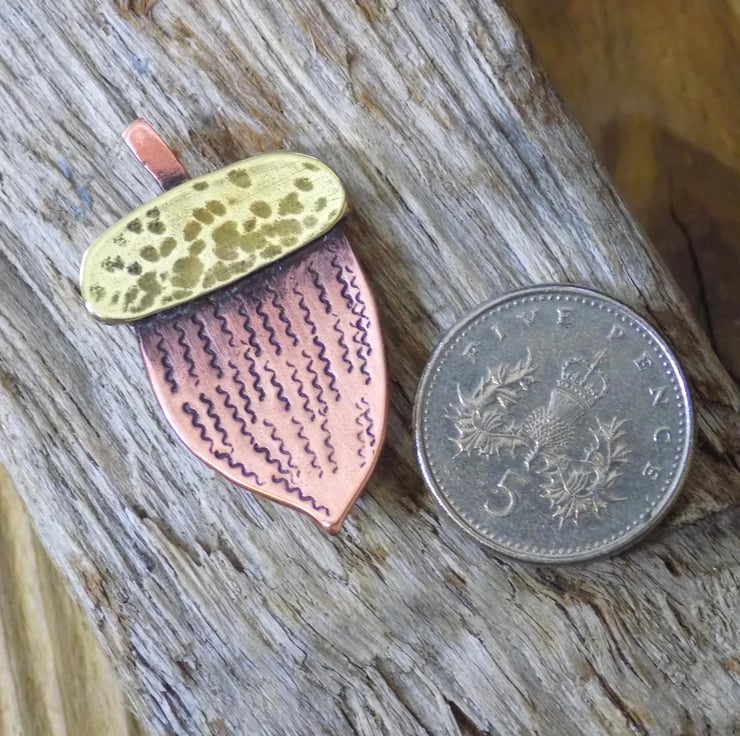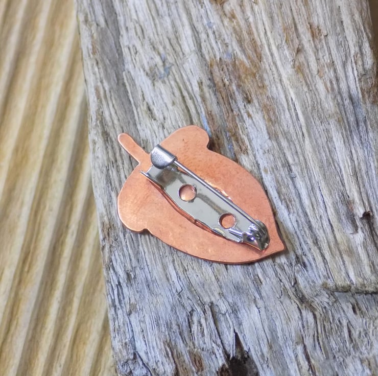 Hand sawn from copper and brass sheet. The brass cap of the acorn has been soldered onto the copper ,textured with a punch and given an aged finish. A small brooch fitting has been fixed to the back with strong jewellers glue.