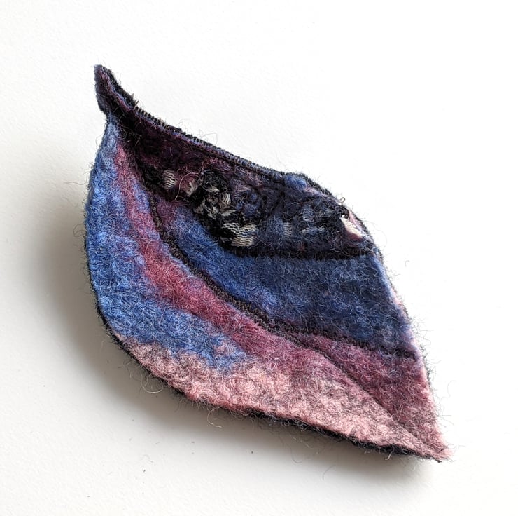 Felted leaf brooch. Shades of blues and pink merino overlay a black base, embellished with printed net scraps and freehand machine embroidery.