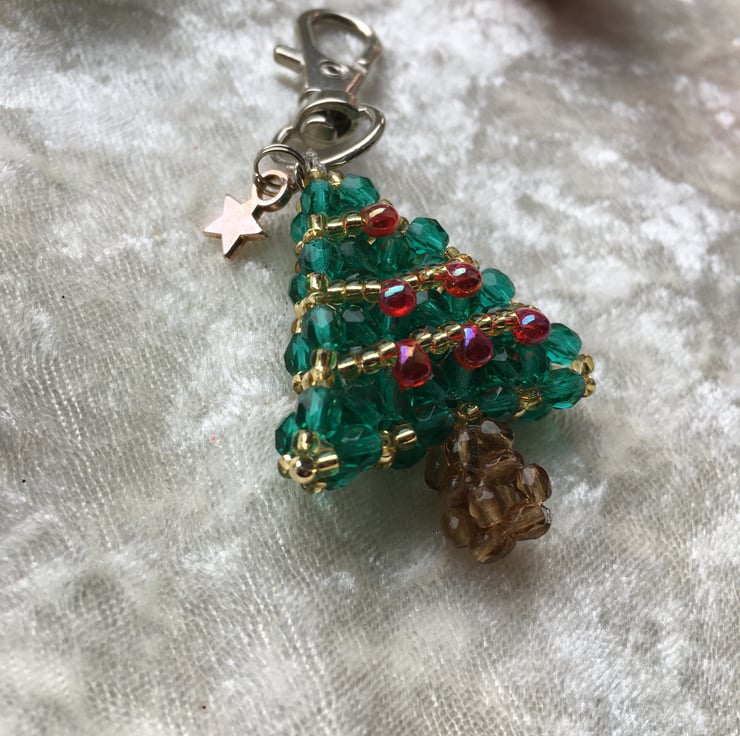 This is a 3D Christmas tree keyring which made by me. I used Czech glass beads, Japanese seed beads and drop shaped beads to make. It’s very pretty and perfect for the Christmas season. The Christmas tree is 4cm of size.