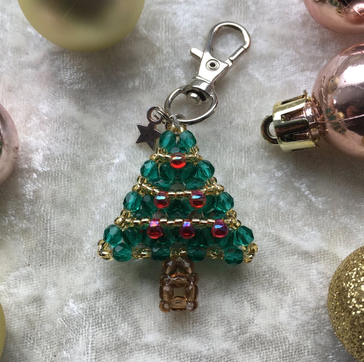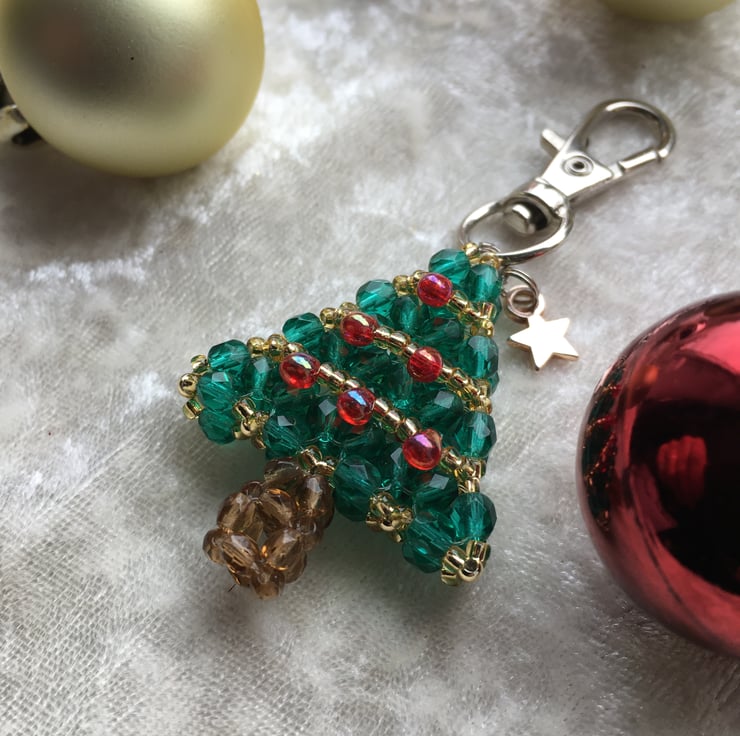 This is a 3D Christmas tree keyring which made by me. I used Czech glass beads, Japanese seed beads and drop shaped beads to make. It’s very pretty and perfect for the Christmas season. The Christmas tree is 4cm of size.
