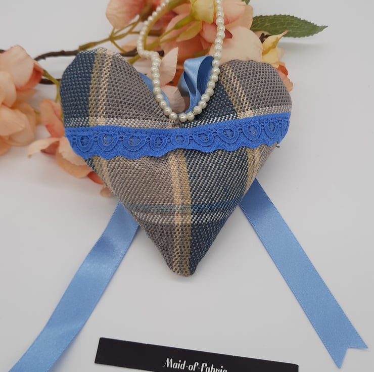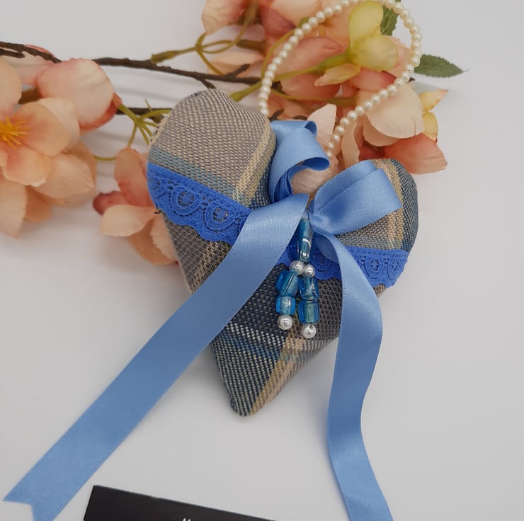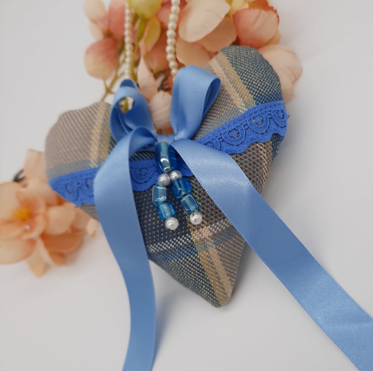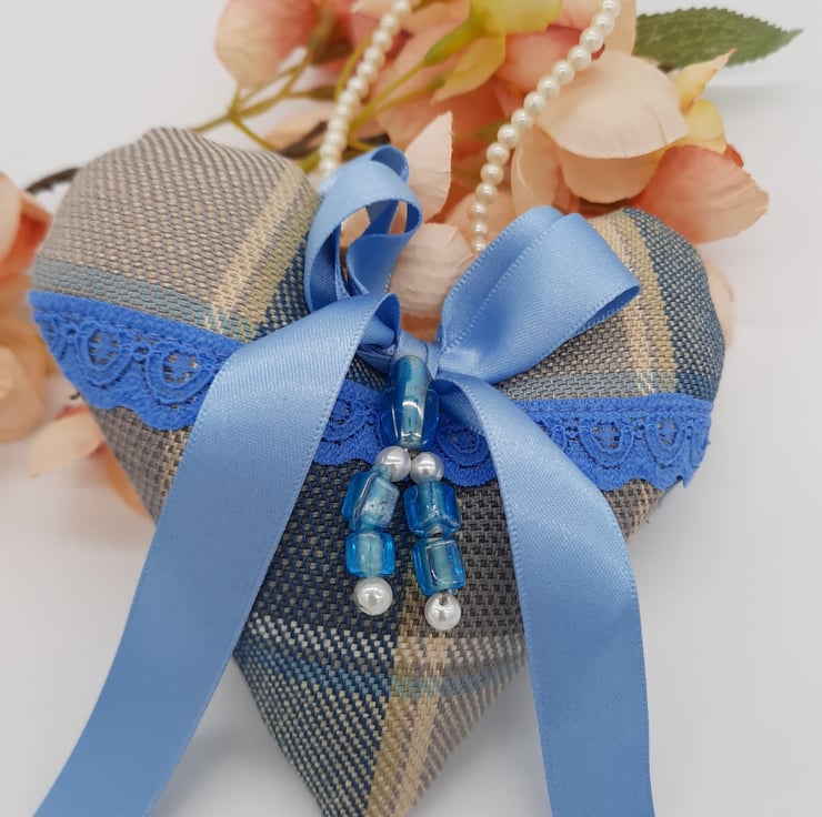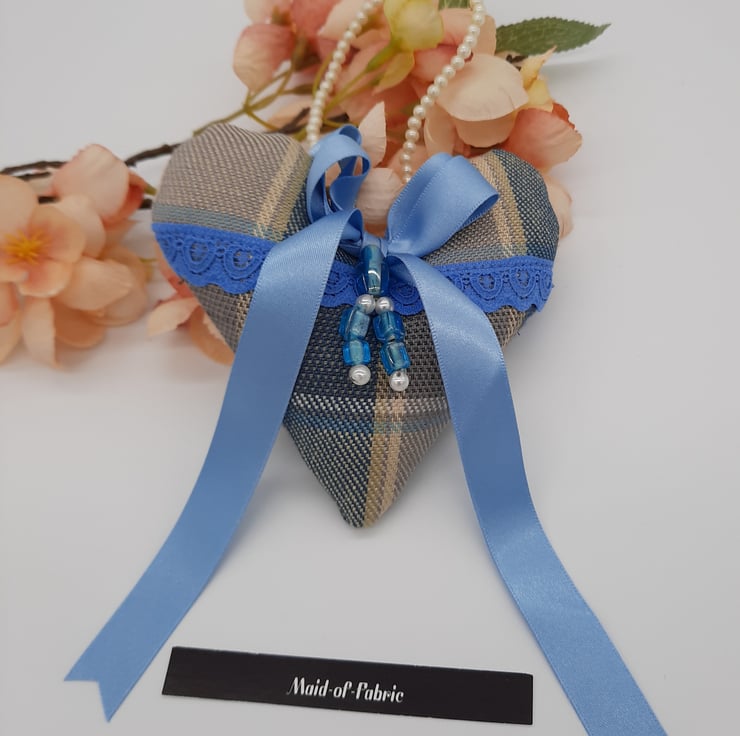 Heart hanger made using a blue and cream tartan fabric, blue lace, blue ribbon, blue glass beads and pearl beads.