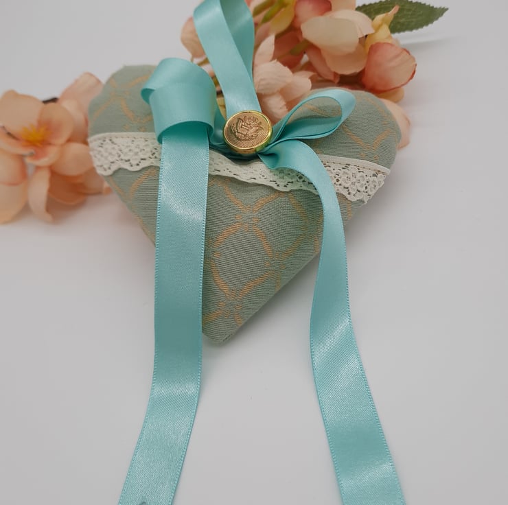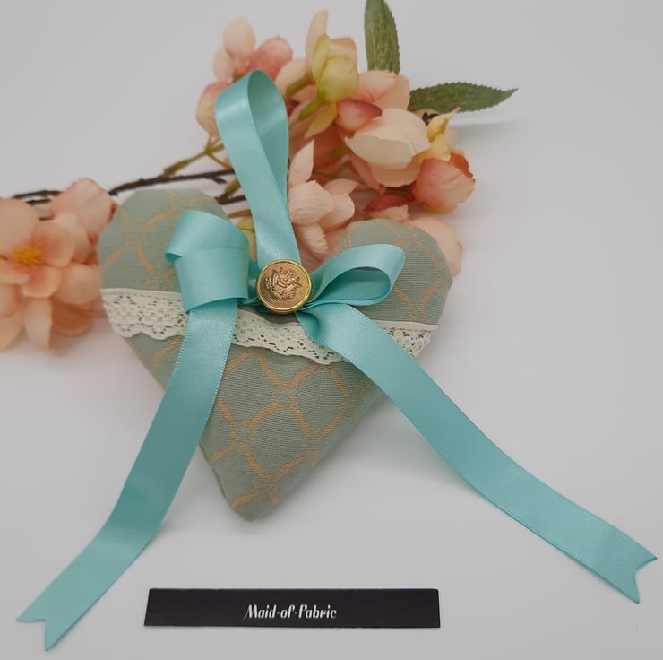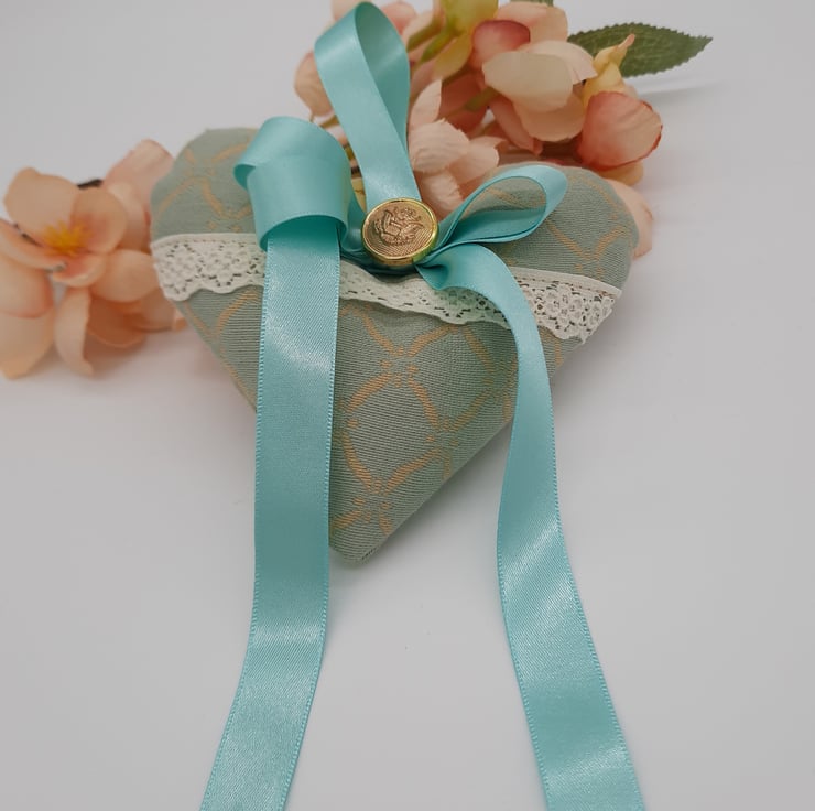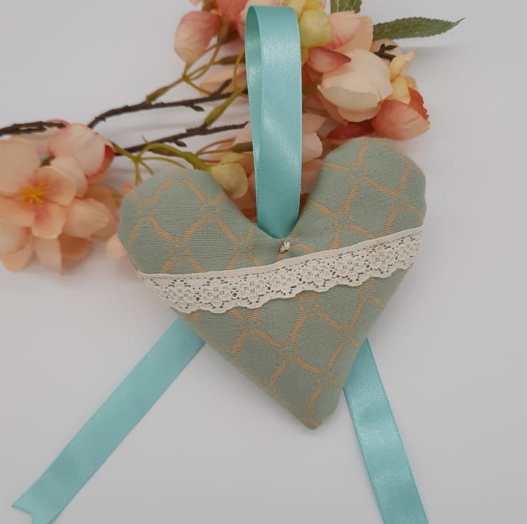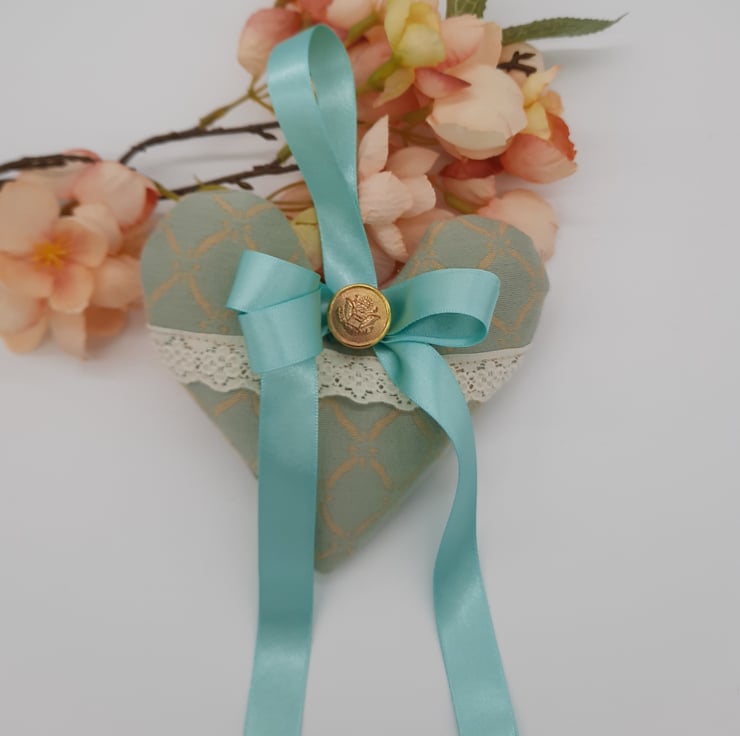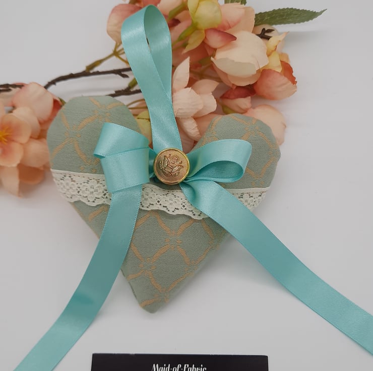Heart hanger made using a green and cream pattern fabric, cream lace, mint green ribbon and a gold button.