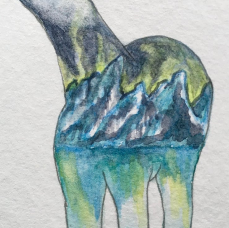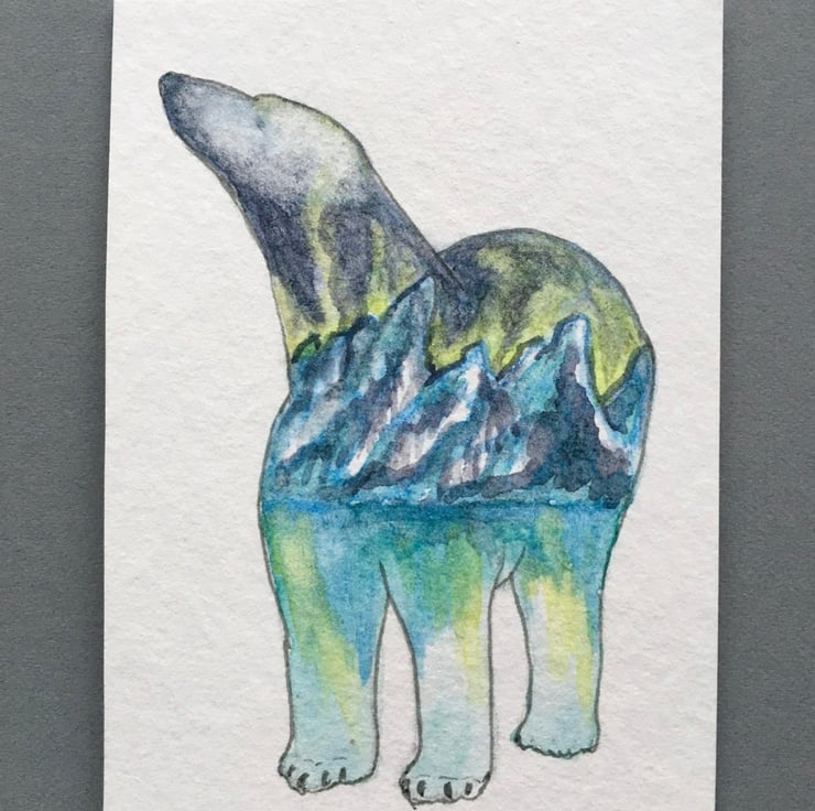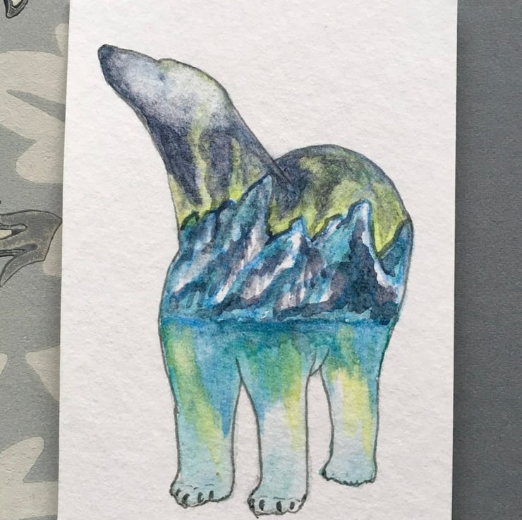 This is a hand painted watercolour aceo showing an arctic landscape with northern lights and polar bear. It measures 3.5” x 2.5” and is painted on 300gsm watercolour paper.