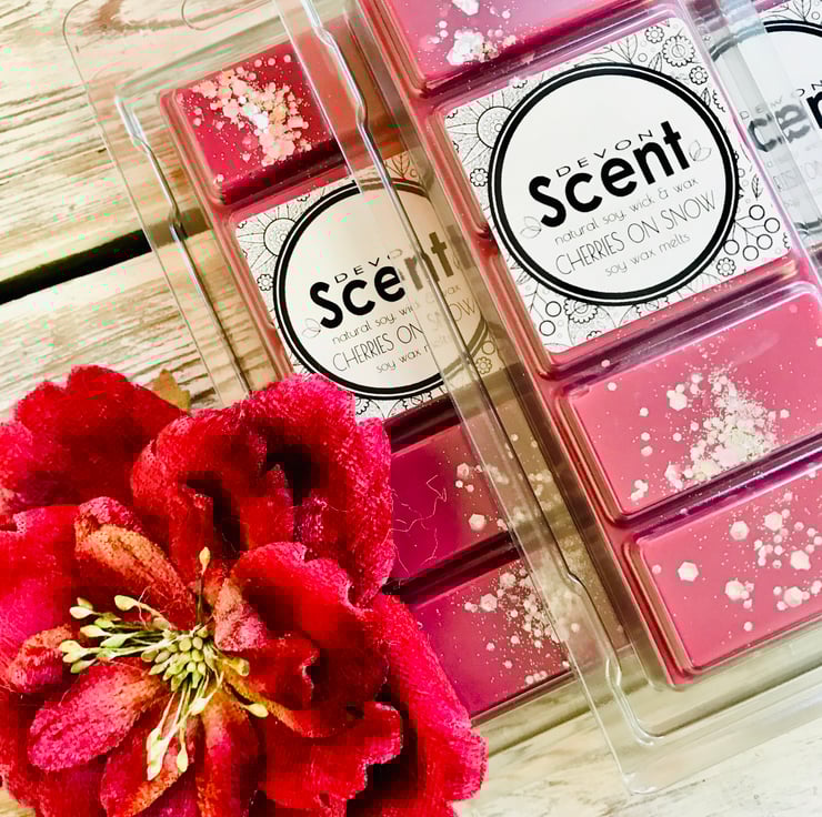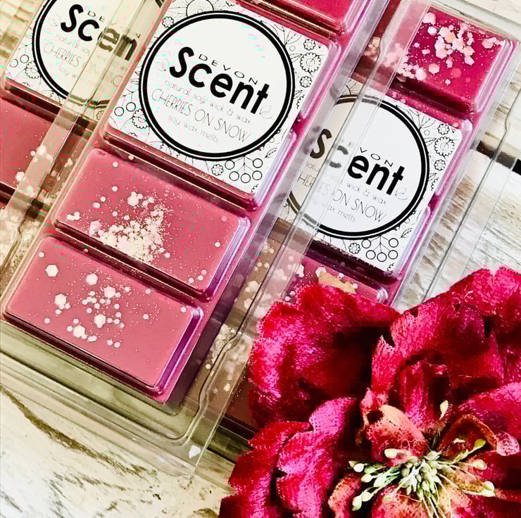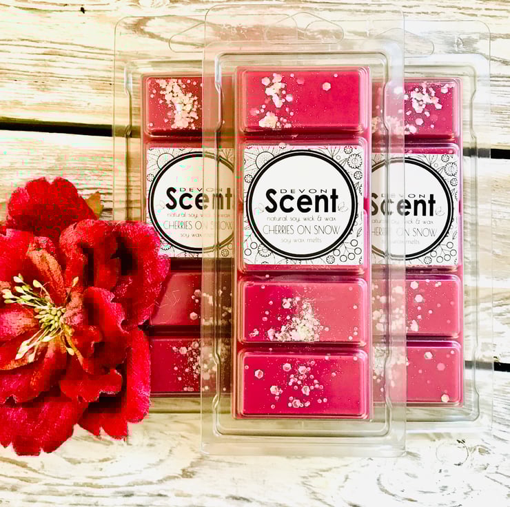 Our highly fragranced long lasting Cherries on Snow Snap Bar Wax Melts have a sweet frosty snow accord with fresh cherries, icy ozonic notes leading to a woody floral accord with hints of musk.