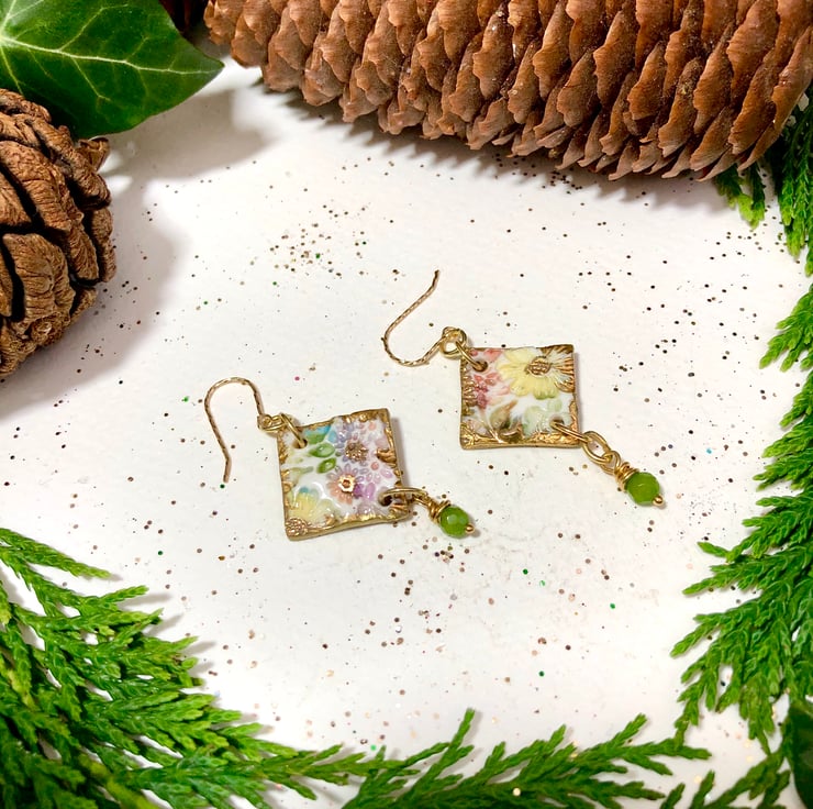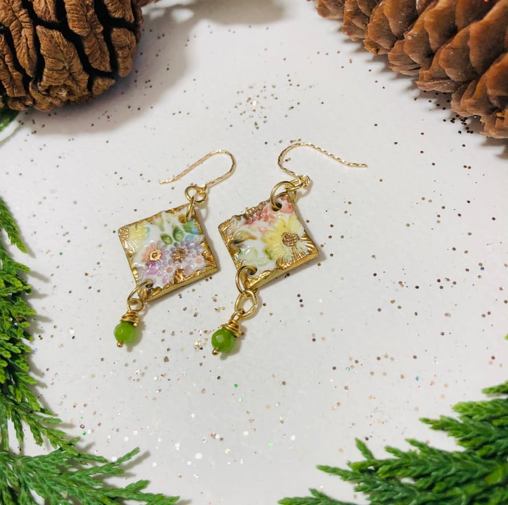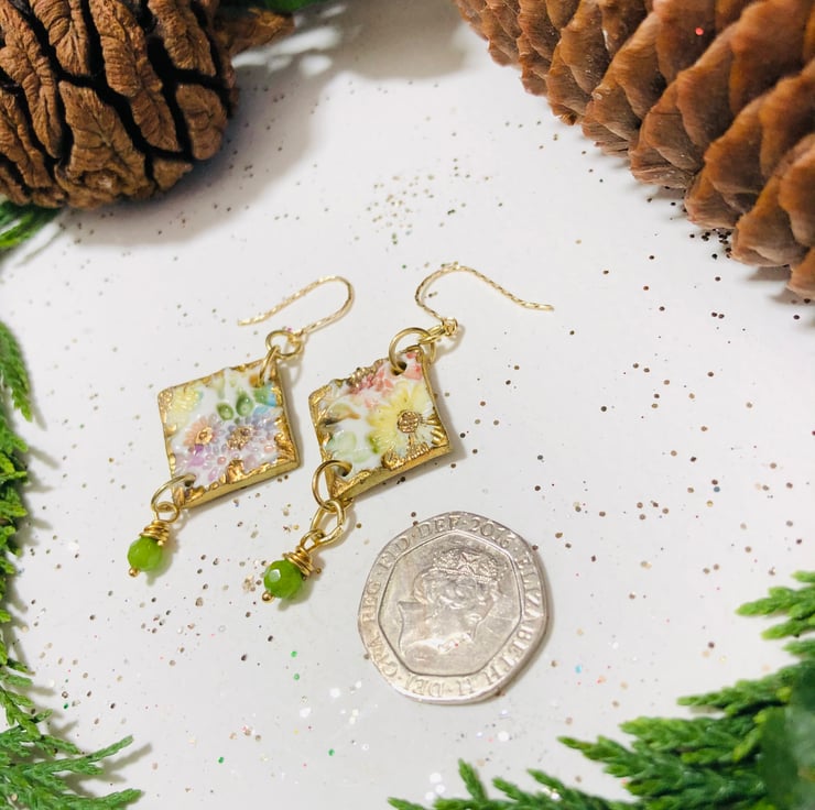 Handcrafted beautiful porcelain earrings with emeralds . Hand painted with bright beautiful colours and real 22 carat gold lustre.