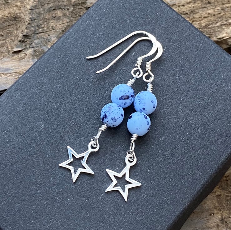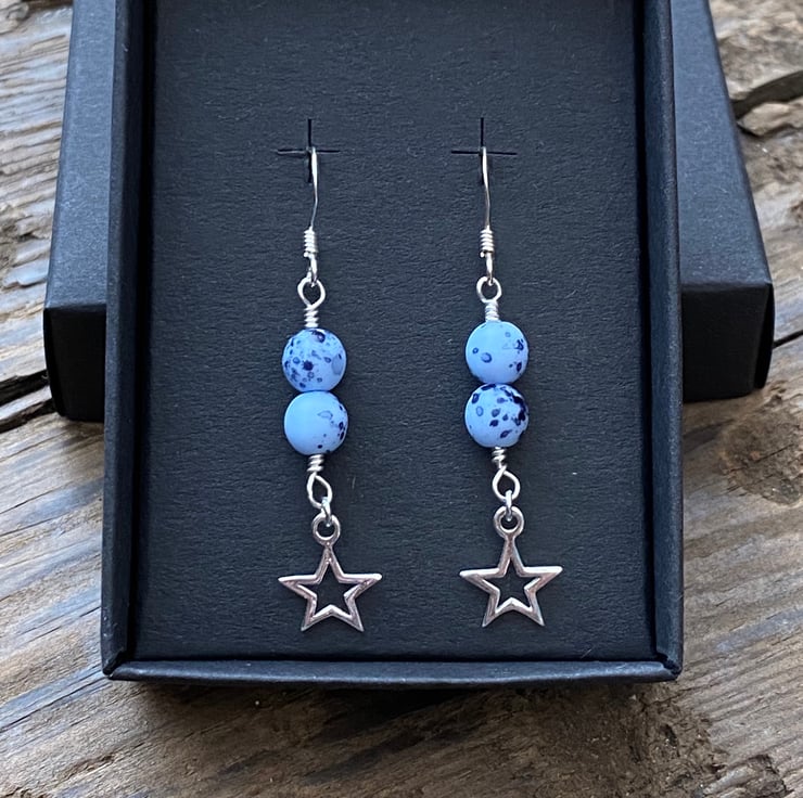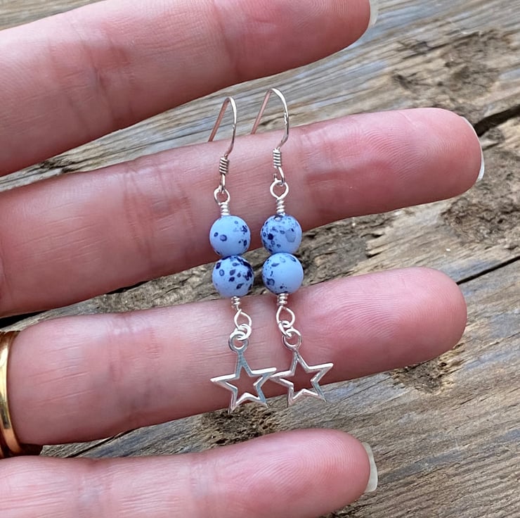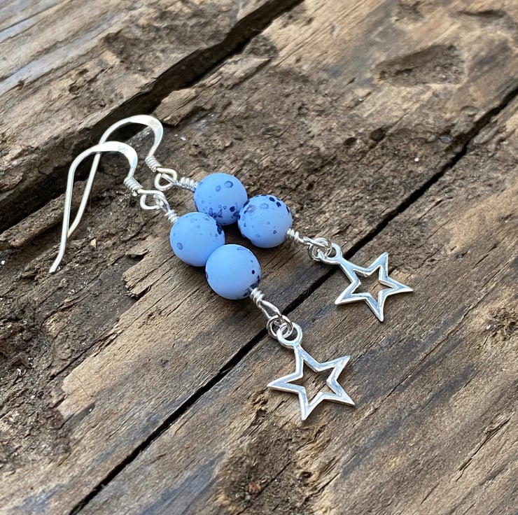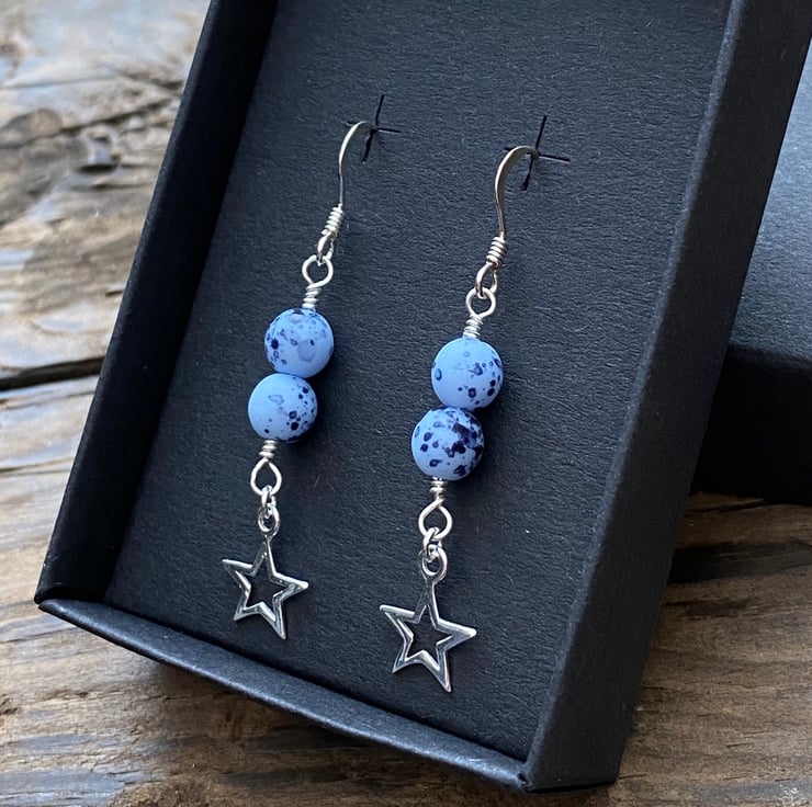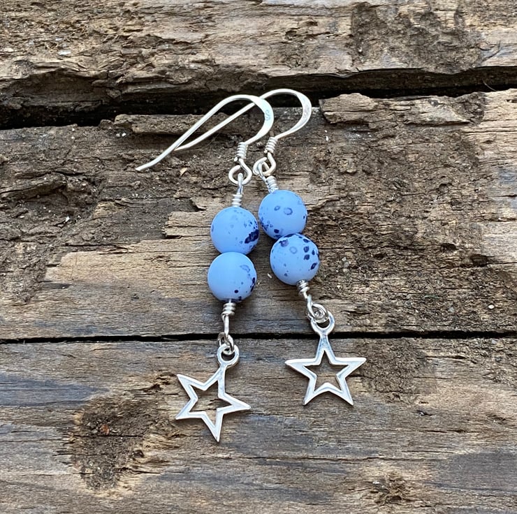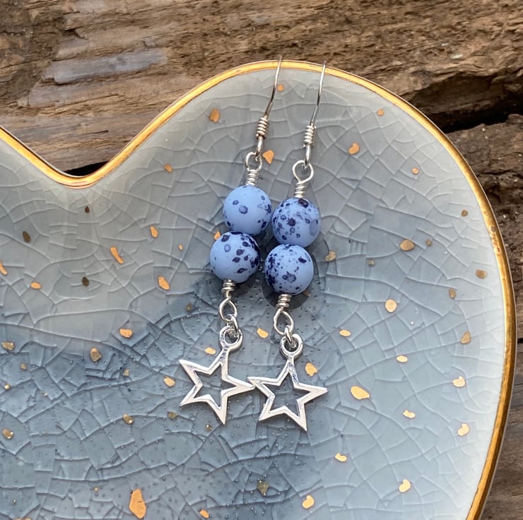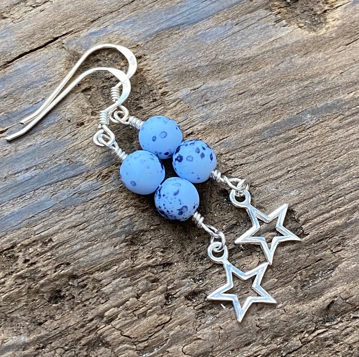 Speckled blue Czech glass beads have been hand wired onto sterling silver wire. Beneath the beads hangs a single sterling silver star. All hung from sterling silver earrings.