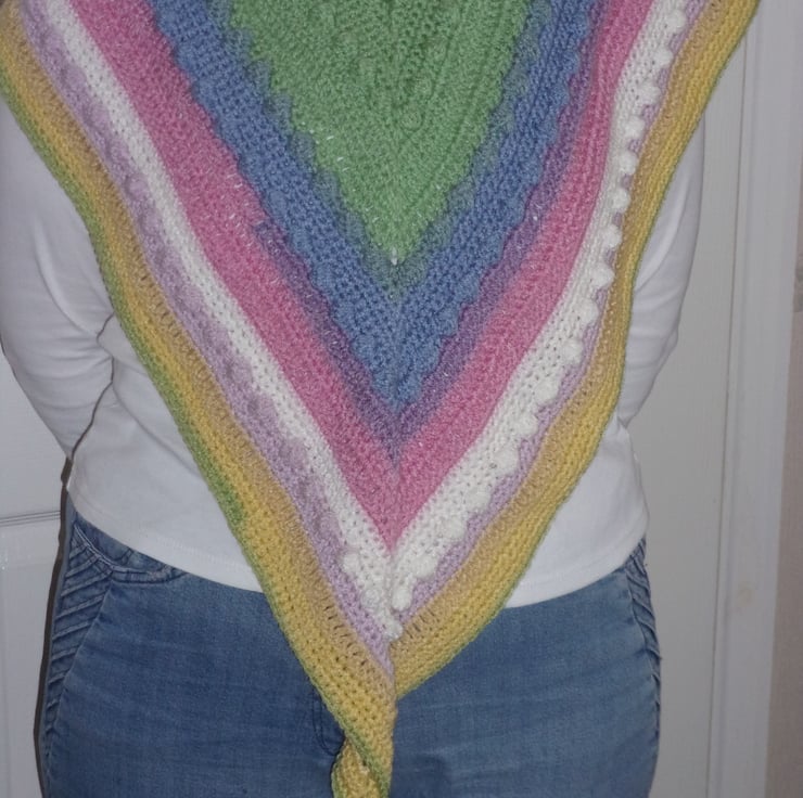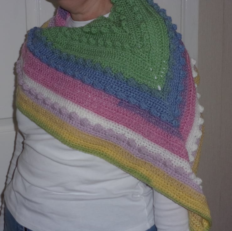 This hand crocheted Bobble Scarf Shawl is a lovely addition to your wardrobe as it can be used either way round - as a scarf under a coat or a small shawl just to keep your shoulders warm during chilly winter evenings or if you need something other than a Jacket during the Spring / Autumn evenings.