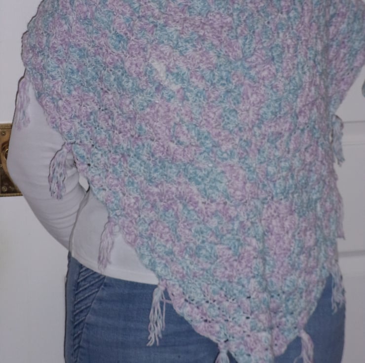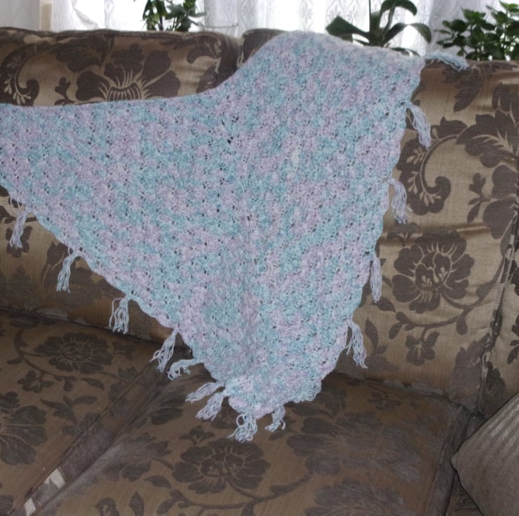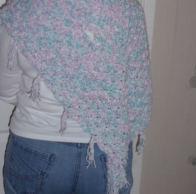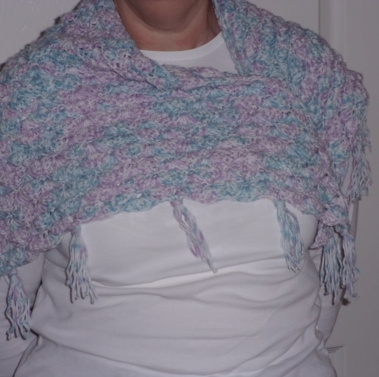This beautiful Shawl Scarf is made using a variegated baby yarn called Peek-a-boo by Sirdar - in pastel shades of white, lavender and blue.