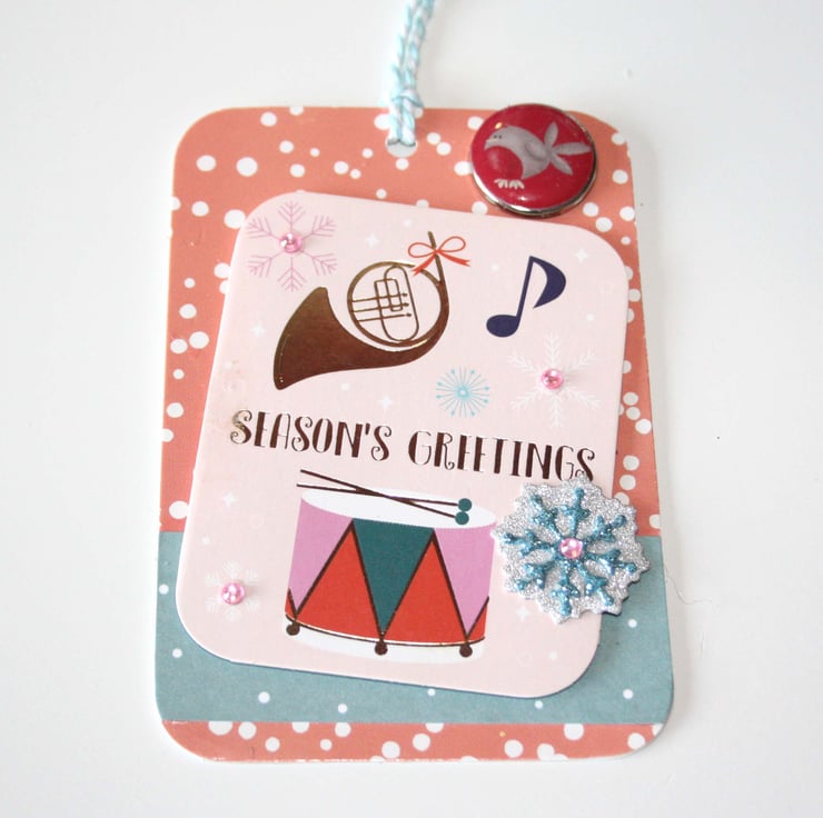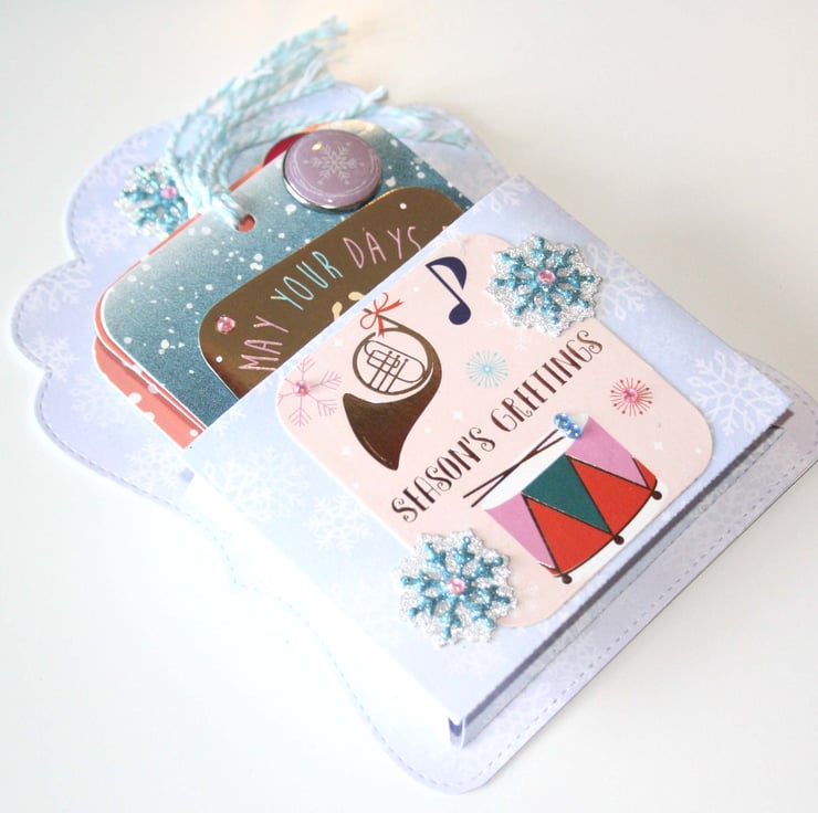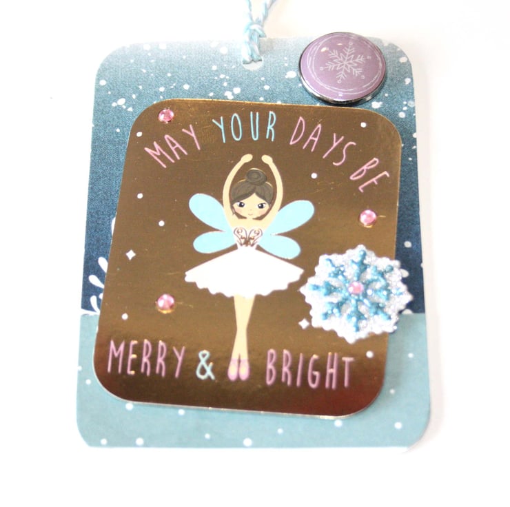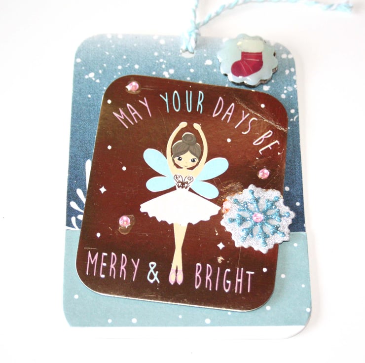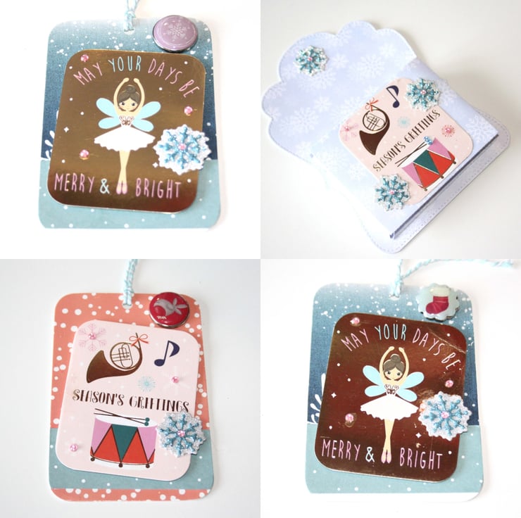 Each tag features a Christmas topper, flat back gems and die cut snowflakes. In each corner is a metal brad with a Christmas design.