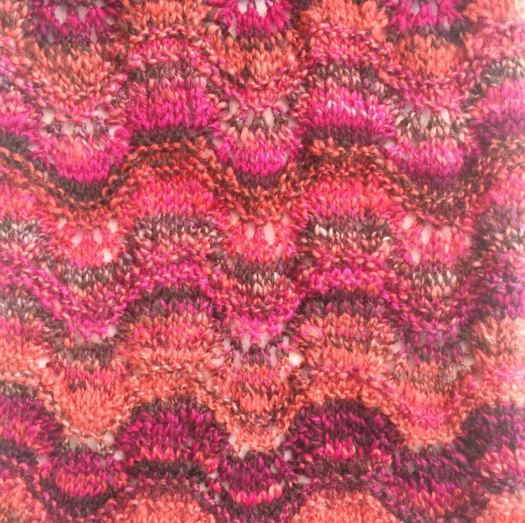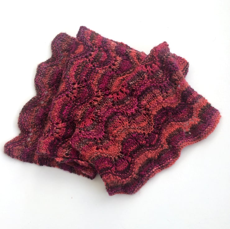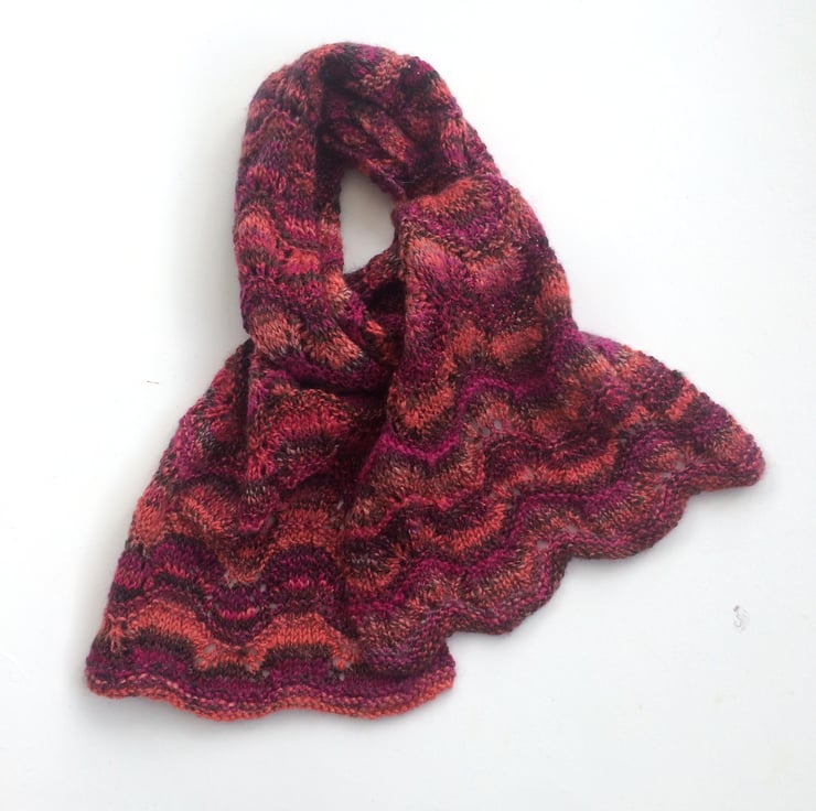 Beautiful hand knitted scarf in a lace wave pattern. Knit in some lovely locally hand dyed yarn , a mix of wool and silk. Stunning scarf to be worn at a specal occasion.