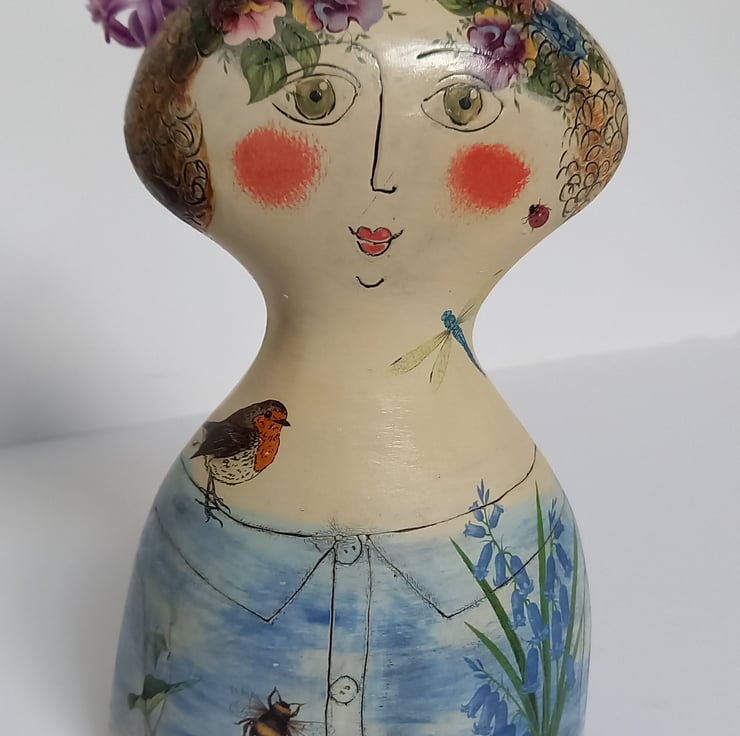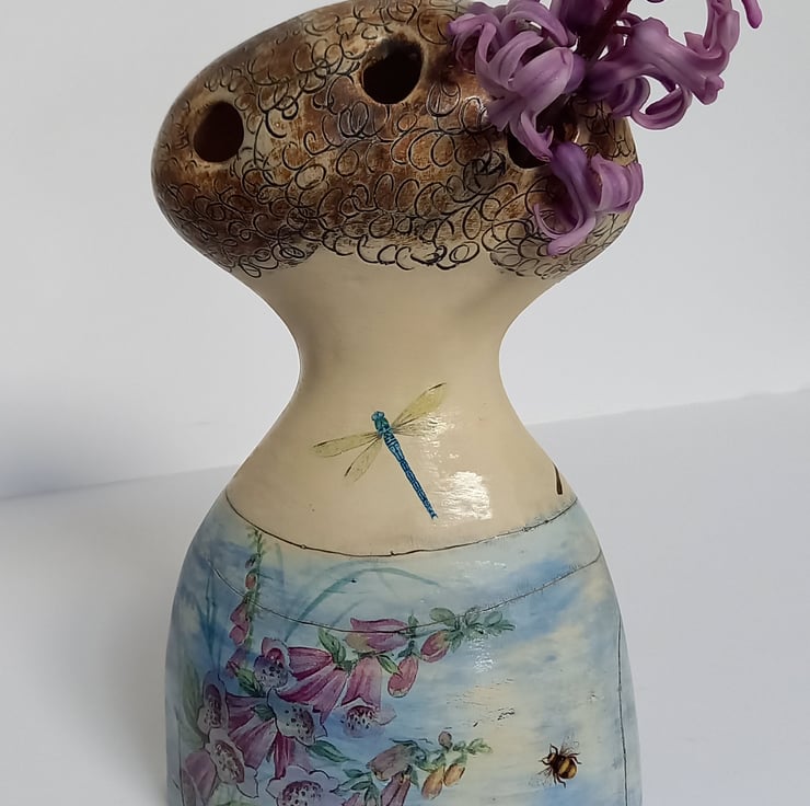 Hand made with white clay this figurative vase measures approximately 23 cm in height .Drawn and painted with coloured slips and glazed in a semi matt transparent glaze. Ceramic decals of birds ,flowers and insects are fired on to add detail. Opening at the back allow for dried flowers or grasses.Will be carefully packed and posted.