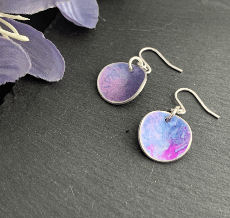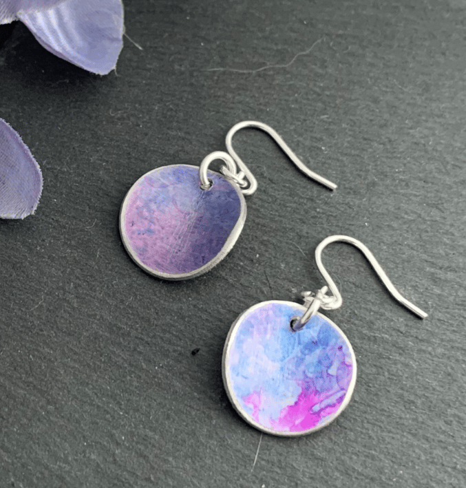 Aluminium disc - hand printed in purples, blues and pink. The discs also have a slight curve to them.